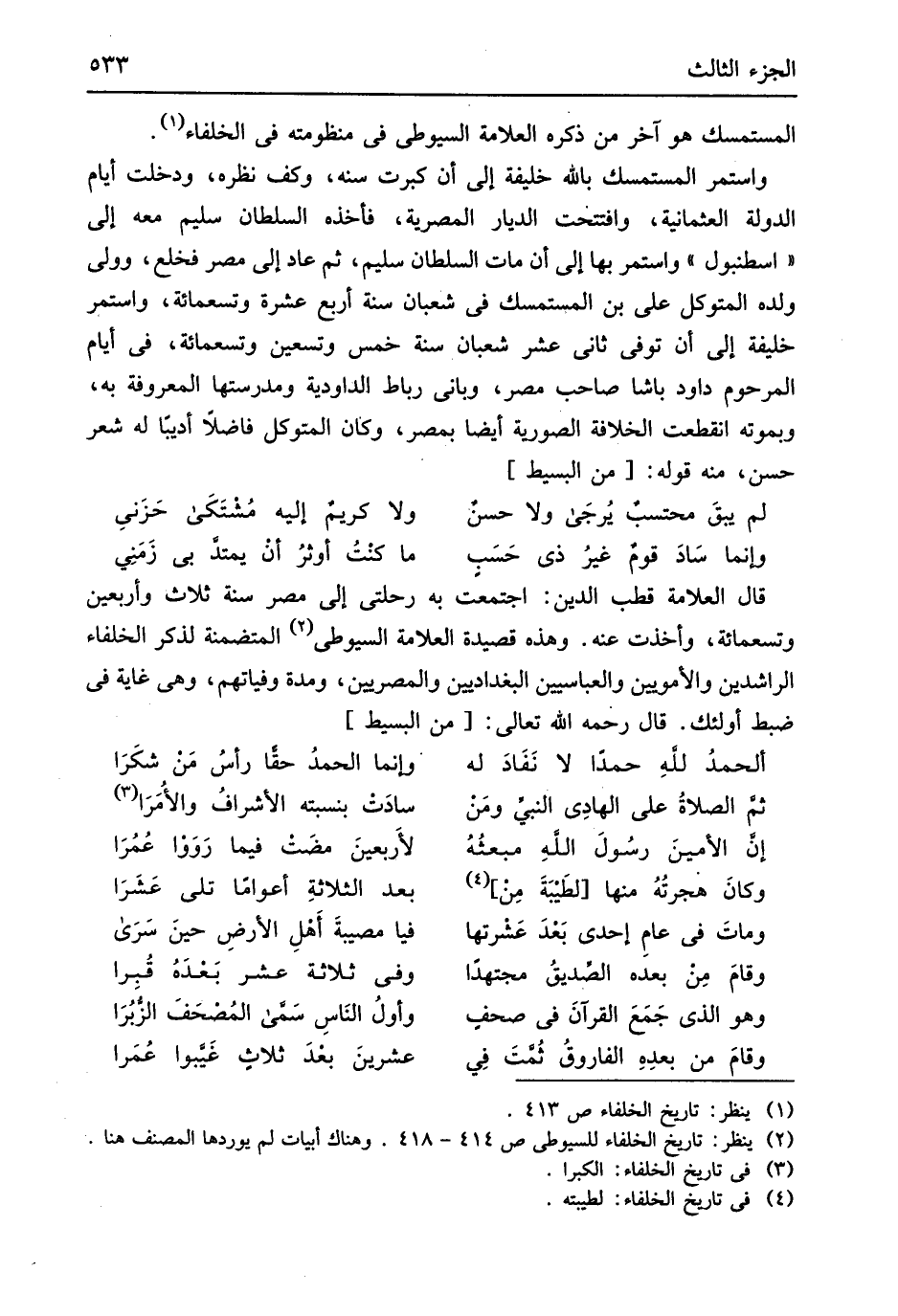 قَالَ الْعَلامَة قطب الدّين اجْتمعت بِهِ رحلتي إِلَى مصر سنة ثَلَاث وَأَرْبَعين وَتِسْعمِائَة وَأخذت عَنهُ وَهَذِه قصيدة الْعَلامَة السُّيُوطِيّ المتضمنة لذكر الْخُلَفَاء الرَّاشِدين والأمويين والعباسيين والبغداديين والمصريين وَمُدَّة وفياتهم وَهِي غَايَة فِي ضبط أُولَئِكَ قَالَ رَحمَه الله تَعَالَى من // (الْبَسِيط) //