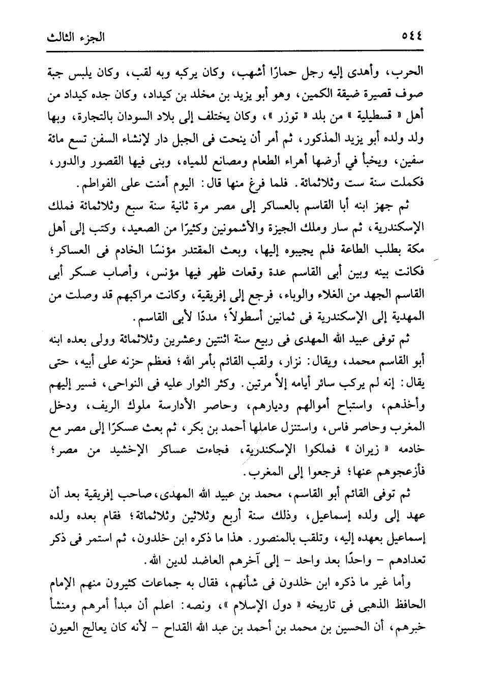 الْحَرْب وَأهْدى إِلَيْهِ رجل حمارا أَشهب وَكَانَ يركبه وَبِه لقب وَكَانَ يلبس جُبَّة صوف قَصِيرَة ضيقَة الكمين وَهُوَ أَبُو يزِيد بن مخلد بن كيداد وَكَانَ جده كيداد من أهل قسطيلية من بلد توزر وَكَانَ يخْتَلف إِلَى بِلَاد السودَان بِالتِّجَارَة وَبهَا ولد وَلَده أَبُو يزِيد الْمَذْكُور ثمَّ أَمر أَن ينحت فِي الْجَبَل دَار لإنشاء السفن تسع مائَة سفين ويخبأ فِي أرْضهَا أهراء الطَّعَام ومصانع اللمياه وَبنى فِيهَا الْقُصُور والدور فكملت سنة سِتّ وثلاثمائة فَلَمَّا فرغ مِنْهَا قَالَ الْيَوْم أمنت على الفواطم ثمَّ جهز ابْنه أَبَا الْقَاسِم بالعساكر إِلَى مصر مرّة ثَانِيَة سنة سبع وثلاثمائة فَملك الْإسْكَنْدَريَّة ثمَّ سَار وَملك الجيزة والأشمونين وَكَثِيرًا من الصَّعِيد وَكتب إِلَى أهل مَكَّة بِطَلَب الطَّاعَة فَلم يُجِيبُوهُ إِلَيْهَا وَبعث المقتدر مؤنساً الْخَادِم فِي العساكر فَكَانَت بَينه وَبَين أبي الْقَاسِم عدَّة وقعات ظهر فِيهَا مؤنس وَأصَاب عَسْكَر أبي الْقَاسِم الْجهد من الغلاء والوباء فَرجع إِلَى إفريقية وَكَانَت مراكبهم قد وصلت من المهدية إِلَى الْإسْكَنْدَريَّة فِي ثَمَانِينَ أسطولاَ مددَاً لأبي الْقَاسِم ثمَّ توفّي عبيد الله الْمهْدي فِي ربيع سنة اثْنَتَيْنِ وَعشْرين وثلاثمائة وَولي بعده ابْنه أَبُو الْقَاسِم مُحَمَّد وَيُقَال نزار ولقب الْقَائِم بِأَمْر الله فَعظم حزنه على أَبِيه حَتَّى يُقَال إِنَّه لم يركب سَائِر أَيَّامه إِلَّا مرَّتَيْنِ وَكثر الثوار عَلَيْهِ فِي النواحي فسير إِلَيْهِم وَأَخذهم واستباح أَمْوَالهم وديارهم وحاصر الأدارسة مُلُوك الرِّيف وَدخل الْمغرب وحاصر فاس واستنزل عاملها أَحْمد بن بكر ثمَّ بعث عسكراً إِلَى مصر مَعَ خادمه زيران فملكوا الْإسْكَنْدَريَّة فَجَاءَت عَسَاكِر الإخشيد من مصر فأزعجوهم عَنْهَا فَرَجَعُوا إِلَى الْمغرب ثمَّ توفّي الْقَائِم أَبُو الْقَاسِم مُحَمَّد بن عبيد الله الْمهْدي صَاحب إفريقية بعد أَن عهد إِلَى وَلَده إِسْمَاعِيل وَذَلِكَ سنة أَربع وَثَلَاثِينَ وثلاثمائة فَقَامَ بعده وَلَده إِسْمَاعِيل وَذَلِكَ سنة أَربع وَثَلَاثِينَ وثلاثمائة فَقَامَ بعده وَلَده إِسْمَاعِيل بعهده إِلَيْهِ وتلقب بالمنصور هَذَا مَا ذكره ابْن خلدون ثمَّ اسْتمرّ فِي ذكر تعدادهم وَاحِدًا بعد وَاحِد إِلَى آخِرهم العاضد لدين الله وَأما غير مَا ذكره ابْن خلدون فِي شَأْنهمْ فَقَالَ بِهِ جماعات كَثِيرُونَ مِنْهُم الإِمَام الْحَافِظ الذَّهَبِيّ فِي تَارِيخه دوَل الْإِسْلَام وَنَصه اعْلَم أَن مبدأ أَمرهم ومنشأ خبرهم أَن الْحُسَيْن بن مُحَمَّد بن أَحْمد بن عبد الله القداح لِأَنَّهُ كَانَ يعالج الْعُيُون