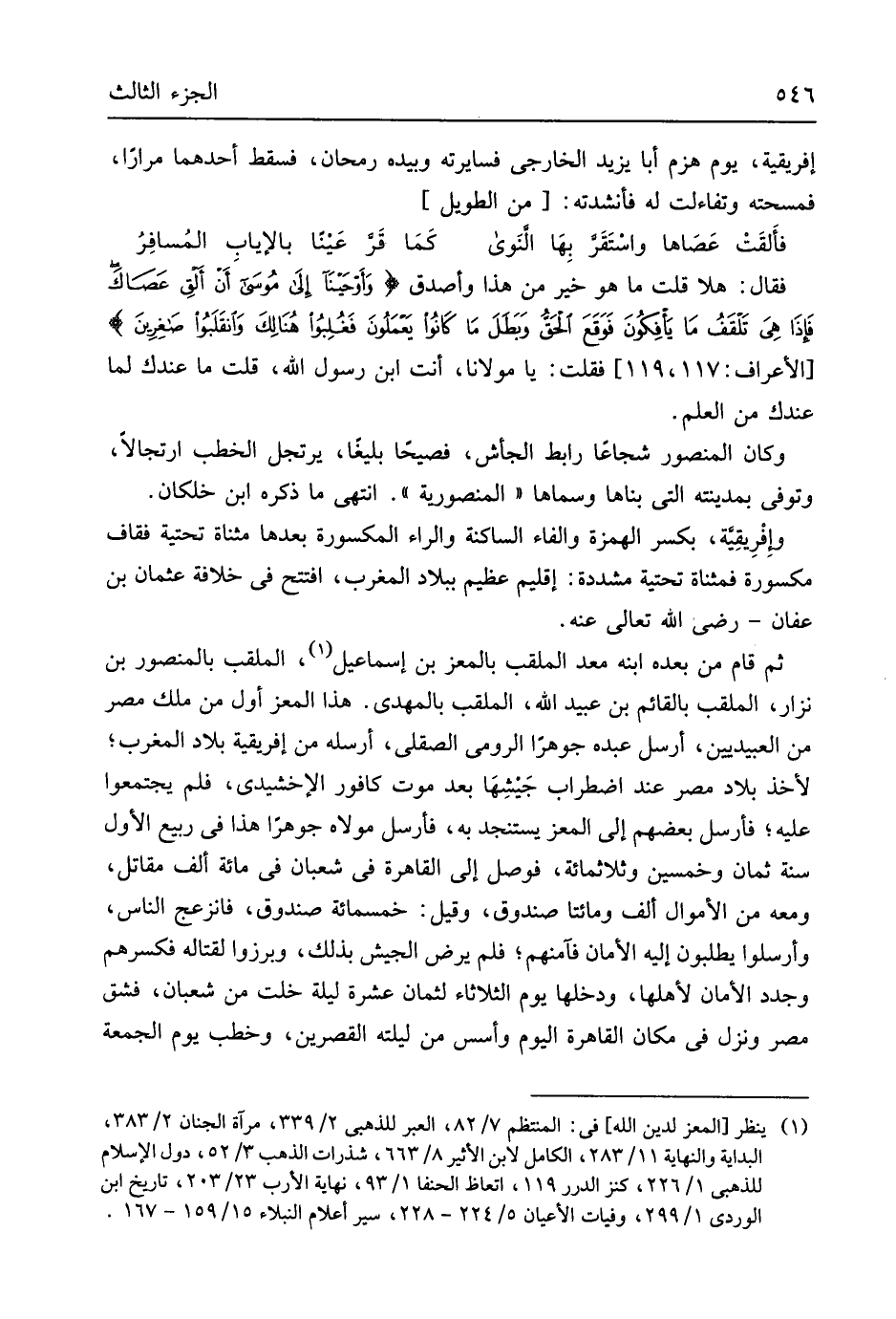 فَقَالَ هلا قلت مَا هُوَ خير من هَذَا وأصدق {وَأَوحَينا إِلىَ مُوسَى أَن ألقِ عَصاك فَإِذا هيَ تَلقَفُ مَا يأفكوُنَ فَوَقَعَ الحقَّ وَبطلَ مَا كَانُوا يعَمَلُونَ فَغُلِبوُا هُنَالِكَ وَاَنقَلَبوُا صاغِريِن} الْأَعْرَاف 117 119 فَقلت يَا مَوْلَانَا أَنْت ابْن رَسُول الله قلت مَا عنْدك لما عنْدك من الْعلم وَكَانَ الْمَنْصُور شجاعاً رابط الجأش فصيحاً بليغَاً يرتجل الْخطب ارتجالا وَتُوفِّي بمدينته الَّتِي بناها وسماها المنصورية انْتهى مَا ذكره ابْن خلكان وإفريقية بِكَسْر الْهمزَة وَالْفَاء الساكنة وَالرَّاء الْمَكْسُورَة بعْدهَا مثناة تحتية فقاف مَكْسُورَة فمثناة تحتية مُشَدّدَة إقليم عَظِيم بِبِلَاد الْمغرب افْتتح فِي خلَافَة عُثْمَان بن عَفَّان رَضِي الله تَعَالَى عَنهُ ثمَّ قَامَ من بعده ابْنه معد الملقب بالمعز بن إِسْمَاعِيل الملقب بالمنصور بن نزار الملقب بالقائم بن عبيد الله الملقب بالمهدي هَذَا الْمعز أول من ملك مصر من العبيديين أرسل عَبده جوهراً الرُّومِي الصّقليّ أرْسلهُ من إفريقية بِلَاد الْمغرب لأخذ بِلَاد مصر عِنْد اضْطِرَاب جَيشِهَا بعد موت كافور الإخشيدي فَلم يجتمعوا عَلَيْهِ فَأرْسل بَعضهم إِلَى الْمعز يستنجد بِهِ فَأرْسل مَوْلَاهُ جوهراً هَذَا فِي ربيع الأول سنة ثَمَان وَخمسين وثلاثمائة فوصل إِلَى الْقَاهِرَة فِي شعْبَان فِي مائَة ألف مقَاتل وَمَعَهُ من الْأَمْوَال ألف وَمِائَتَا صندوق وَقيل خَمْسمِائَة صندوق فانزعج النَّاس وَأَرْسلُوا يطْلبُونَ إِلَيْهِ الْأمان فآمنهم فَلم يرض الْجَيْش بذلك وبرزوا لقتاله فكسرهم وجدد الْأمان لأَهْلهَا ودخلها يَوْم الثُّلَاثَاء لثمان عشرَة لَيْلَة خلت من شعْبَان فشق مصر وَنزل فِي مَكَان الْقَاهِرَة الْيَوْم وَأسسَ من ليلته القصرين وخطب يَوْم الْجُمُعَة