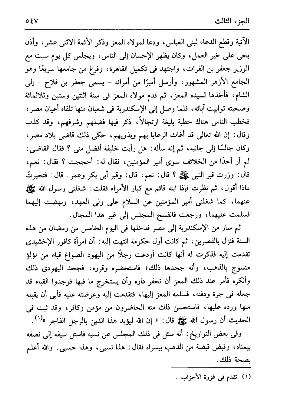 عَنْهُمَا كَمَا شغلني أَمِير الْمُؤمنِينَ عَن السَّلَام على ولي الْعَهْد ونهضت إِلَيْهِمَا فَسلمت عَلَيْهِمَا وَرجعت فانفسح الْمجْلس إِلَى غير هَذَا المجال ثمَّ سَار من الْإسْكَنْدَريَّة إِلَى مصر فَدَخلَهَا فِي الْيَوْم الْخَامِس من رَمَضَان من هَذِه السّنة فَنزل بالقصرين ثمَّ كَانَت أول حُكُومَة انْتَهَت إِلَيْهِ أَن امْرَأَة كافور الإخشيدي تقدّمت إِلَيْهِ فَذكرت لَهُ أَنَّهَا كَانَت أودعت رجلا من الْيَهُود الصواغ قبَاء من لُؤْلُؤ منسوج بِالذَّهَب وَأَنه جَحدهَا ذَلِك فَاسْتَحْضرهُ وَقَررهُ فَجحد الْيَهُودِيّ ذَلِك وَأنْكرهُ فَأمر عِنْد ذَلِك الْمعز أَن تحفر دَاره وَأَن يسْتَخْرج مَا فِيهَا فوجدوا القباء قد جعله فِي جرة وَدَفنه فسلمه الْمعز إِلَيْهَا فتقدمت إِلَيْهِ وعرضته عَلَيْهِ فَأبى أَن يقبله مِنْهَا ورده عَلَيْهَا فَاسْتحْسن ذَلِك مِنْهُ الْحَاضِرُونَ من مُؤمن وَكَافِر وَقد ثَبت فِي الحَدِيث أَن رَسُول الله