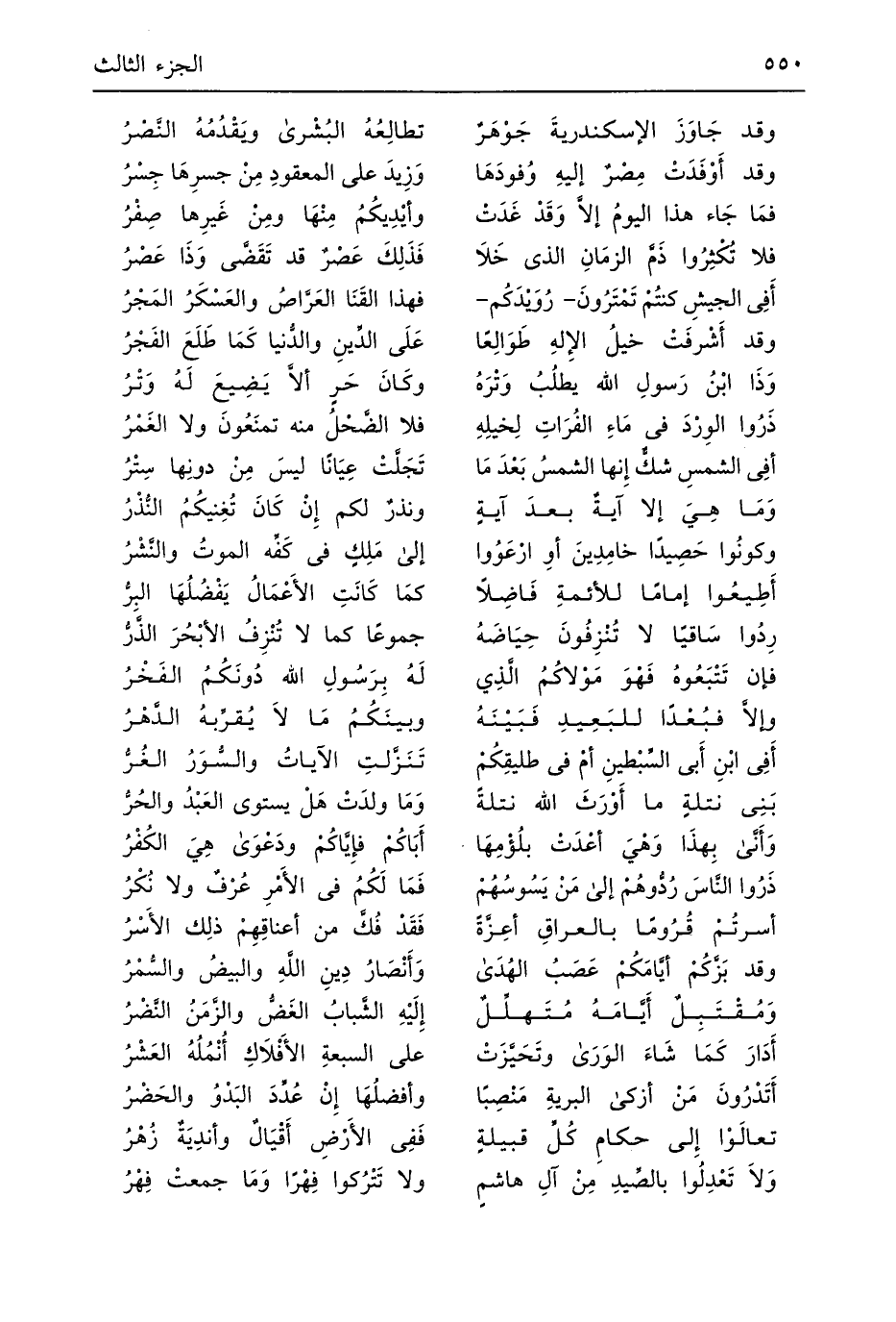 (وَقد بَزَّكُمْ أيَّامَكُمْ عَصَبُ الهُدَى ... وَأَنْصَارُ دِينِ اللهِ والبيضُ والسُّمْرُ)