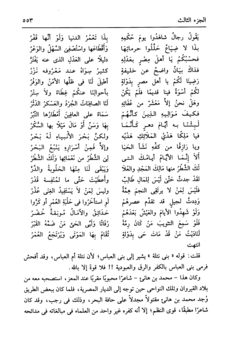 انْتَهَت قلت قَوْله بني نتلة يُشِير إِلَى بني الْعَبَّاس لِأَن نتلة أم الْعَبَّاس وَقد أفحش فَرمى بني الْعَبَّاس بالْكفْر وَالرّق والعبودية فَلَا قوةَ إِلَّا بِاللَّه وَكَانَ هَذَا مُحَمَّد بن هَانِئ شاعرَاً محبوباً مقرباً عِنْد الْمعز استصحبه مَعَه من بِلَاد القيروان وَتلك النواحي حِين توجه إِلَى الديار المصرية فَلَمَّا كَانَ بِبَعْض الطَّرِيق وُجد مُحَمَّد بن هَانِئ مقتولاَ مجدلاَ على حافة الْبَحْر وَذَلِكَ فِي رَجَب وَقد كَانَ شَاعِرًا مطبقاً قوي النّظم إِلَّا أَنه كفره غير وَاحِد من الْعلمَاء فِي مبالغاته فِي مدائحه