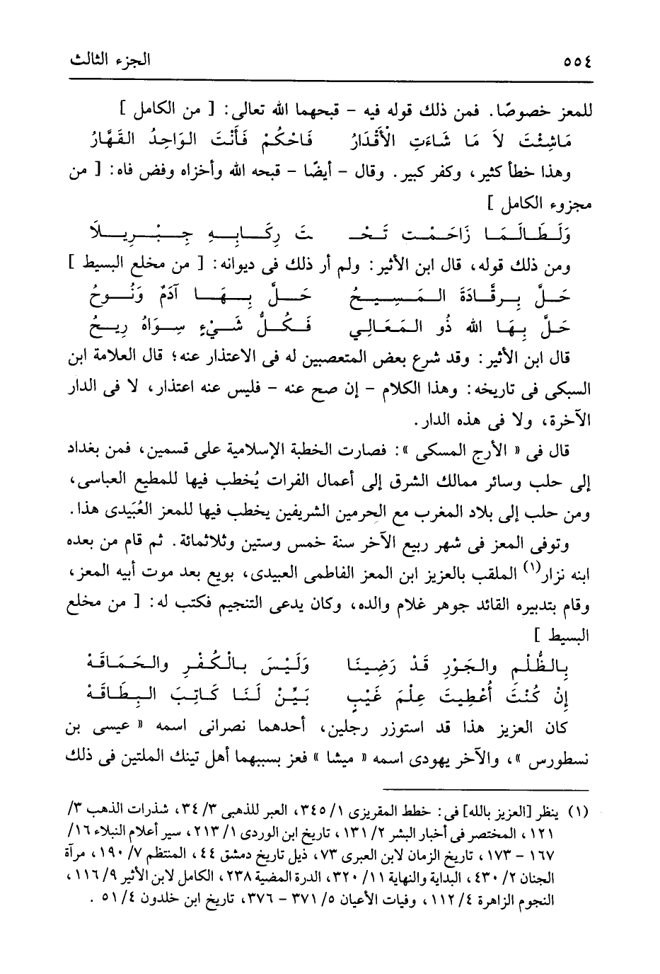 قَالَ ابْن الْأَثِير وَقد شرع بعض المتعصبين لَهُ فِي الِاعْتِذَار عَنهُ قَالَ الْعَلامَة ابْن السُّبْكِيّ فِي تَارِيخه وَهَذَا الْكَلَام إِن صَحَّ عَنهُ فَلَيْسَ عَنهُ اعتذار لَا فِي الدَّار الْآخِرَة وَلَا فِي هَذِه الدَّار قَالَ فِي الأرج المسكي فَصَارَت الْخطْبَة الإسلامية على قسمَيْنِ فَمن بَغْدَاد إِلَى حلب وَسَائِر ممالك الشرق إِلَى أَعمال الْفُرَات يُخطب فِيهَا للمطيع العباسي وَمن حلب إِلَى بِلَاد الْمغرب مَعَ الْحَرَمَيْنِ الشريفين يخْطب فِيهَا للمعز العُبَيدي هَذَا وَتُوفِّي الْمعز فِي شهر ربيع الآخر سنة خمس وَسِتِّينَ وثلاثمائة ثمَّ قَامَ من بعده ابْنه نزار الملقب بالعزيز ابْن الْمعز الفاطمي العبيدي بُويِعَ بعد موت أَبِيه الْمعز وَقَامَ بتدبيره الْقَائِد جَوْهَر غُلَام وَالِده وَكَانَ يَدعِي التنجيم فَكتب لَهُ من // (مخلع الْبَسِيط) //