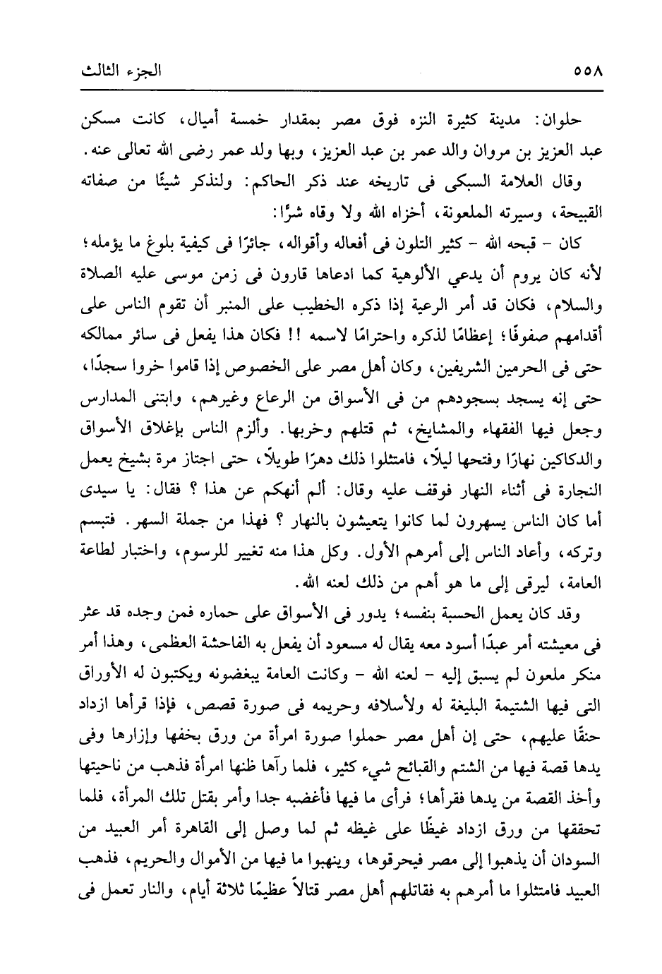 حلوان مَدِينَة كَثِيرَة النزه فَوق مصر بِمِقْدَار خَمْسَة أَمْيَال كَانَت مسكن عبد الْعَزِيز بن مَرْوَان وَالِد عمر بن عبد الْعَزِيز وَبهَا ولد عمر رَضِي الله تَعَالَى عَنهُ وَقَالَ الْعَلامَة السُّبْكِيّ فِي تَارِيخه عِنْد ذكر الْحَاكِم ولنذكر شَيْئا من صِفَاته القبيحة وَسيرَته الملعونة أَخْزَاهُ الله وَلَا وَقَاه شرا كَانَ قبحه الله كثير التلون فِي أَفعاله وأقواله جَائِزا فِي كَيْفيَّة بُلُوغ مَا يؤمله لِأَنَّهُ كَانَ يروم أَن يَدعِي الألوهية كَمَا ادَّعَاهَا قَارون فِي زمن مُوسَى عَلَيْهِ الصَّلَاة السَّلَام فَكَانَ قد أَمر الرّعية إِذا ذكره الْخَطِيب على الْمِنْبَر أَن تقوم النَّاس على أَقْدَامهم صُفُوفا إعظاماً لذكره واحترامَاً لاسمه فَكَانَ هَذَا يفعل فِي سَائِر ممالكه حَتَّى فِي الْحَرَمَيْنِ الشريفين وَكَانَ أهل مصر على الْخُصُوص إِذا قَامُوا خروا سجدا حَتَّى إِنَّه يسْجد بسجودهم من فِي الْأَسْوَاق من الرعاع وَغَيرهم وابتنى الْمدَارِس وَجعل فِيهَا الْفُقَهَاء والمشايخ ثمَّ قَتلهمْ وخربها وألزم النَّاس بإغلاق الْأَسْوَاق والدكاكين نَهَارا وَفتحهَا ليلاَ فامتثلوا ذَلِك دهرَاً طَويلا حَتَّى اجتاز مرّة بشيخ يعْمل النجارة فِي أثْنَاء النَّهَار فَوقف عَلَيْهِ وَقَالَ ألم أنهكم عَن هَذَا فَقَالَ يَا سَيِّدي أما كَانَ النَّاس يسهرون لما كَانُوا يتعيشون بِالنَّهَارِ فَهَذَا من جملَة السهر فَتَبَسَّمَ وَتَركه وَأعَاد النَّاس إِلَى أَمرهم الأول وكل هَذَا مِنْهُ تَغْيِير للرسوم واختبار لطاعة الْعَامَّة ليرقى إِلَى مَا هُوَ أهم من ذَلِك لَعنه الله وَقد كَانَ يعْمل الْحِسْبَة بِنَفسِهِ يَدُور فِي الْأَسْوَاق على حِمَاره فَمن وجده قد عثر فِي معيشته أَمر عبدَاً أسود مَعَه يُقَال لَهُ مَسْعُود أَن يفعل بِهِ الْفَاحِشَة العمطى وَهَذَا أَمر مُنكر مَلْعُون لم يسْبق إِلَيْهِ لَعنه الله وَكَانَت الْعَامَّة يبغضونه ويكتبون لَهُ الأوراق الَّتِي فِيهَا الشتيمة البليغة لَهُ ولأسلافه وحريمه فِي صُورَة قصَص فَإِذا قَرَأَهَا ازْدَادَ حنقَاً عَلَيْهِم حَتَّى إِن أهل مصر حملُوا صُورَة امْرَأَة من ورق بخفها وإزارها وَفِي يَدهَا قصَّة فِيهَا من الشتم والقبائح شَيْء كثير فَلَمَّا رَآهَا ظَنّهَا امْرَأَة فَذهب من ناحيتها وَأخذ الْقِصَّة من يَدهَا فقرأها فَرَأى مَا فِيهَا فأغضبه جدا وَأمر بقتل تِلْكَ الْمَرْأَة فَلَمَّا تحققها من ورق ازْدَادَ غيظاً على غيظه ثمَّ لما وصل إِلَى الْقَاهِرَة أَمر العبيد من السودَان أَن يذهبوا إِلَى مصر فيحرقوها وينهبوا مَا فِيهَا من الْأَمْوَال والحريم فَذهب العبيد فامتثلوا مَا أَمرهم بِهِ فَقَاتلهُمْ أهل مصر قتالاَ عَظِيما ثَلَاثَة أَيَّام وَالنَّار تعْمل فِي