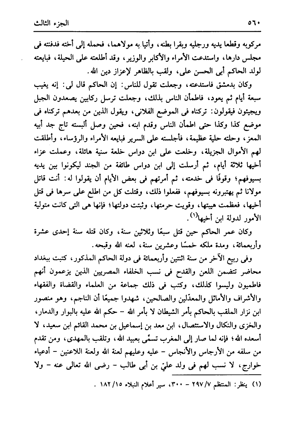 مركوبه وقطعاً يَدَيْهِ وَرجلَيْهِ وبقرا بَطْنه وَأَتيا بِهِ مولاهما فَحَمله إِلَى أُخْته فدفنته فِي مجْلِس دارها واستدعت الْأُمَرَاء والأكابر والوزير وَقد أطلعته على الْحِيلَة فَبَايَعته لولد الْحَاكِم أبي الْحسن عَليّ ولقب بِالظَّاهِرِ لإعزاز دين الله وَكَانَ بِدِمَشْق فاستدعته وَجعلت تَقول للنَّاس إِن الْحَاكِم قَالَ لي إِنَّه يغيب سَبْعَة أَيَّام ثمَّ يعود فاطمأن النَّاس بذلك وَجعلت ترسل ركابين ويصعدون الْجَبَل ويجيئون فَيَقُولُونَ تَرَكْنَاهُ فِي الْموضع الْفُلَانِيّ وَيَقُول الَّذين من بعدهمْ تَرَكْنَاهُ فِي مَوضِع كَذَا وَكَذَا حَتَّى اطْمَأَن النَّاس وَقدم ابْنه فحين وصل ألبسته تَاج جد أَبِيه الْمعز وحلته حلية عَظِيمَة فأجلسته على السرير فَبَايعهُ الْأُمَرَاء والرؤساء وأطلقت لَهُم الْأَمْوَال الجزيلة وخلعت على ابْن دواس خلعة سنية هائلة وعملت عزاء أَخِيهَا ثَلَاثَة أَيَّام ثمَّ أرْسلت إِلَى ابْن دواس طَائِفَة من الْجند ليكونوا بَين يَدَيْهِ بسيوفهم وقوفاً فِي خدمته ثمَّ أَمرتهم فِي بعض الْأَيَّام أَن يَقُولُوا لَهُ أَنْت قَاتل مَوْلَانَا ثمَّ يهتبرونه بسيوفهم فَفَعَلُوا ذَلِك وَقتلت كل من اطلع على سرها فِي قتل أَخِيهَا فعظمت هيبتها وقويت حرمتهَا وَثبتت دولتها فَإِنَّهَا هِيَ الَّتِي كَانَت متولية الْأُمُور لدولة ابْن أَخِيهَا وَكَانَ عمر الْحَاكِم حِين قتل سبعَاً وَثَلَاثِينَ سنة وَكَانَ قَتله سنة إِحْدَى عشرَة وَأَرْبَعمِائَة وَمُدَّة ملكه خمسَاً وَعشْرين سنة لَعنه الله وقبحه وَفِي ربيع الآخر من سنة اثْنَتَيْنِ وَأَرْبَعمِائَة فِي دولة الْحَاكِم الْمَذْكُور كتبت بِبَغْدَاد محَاضِر تَتَضَمَّن اللَّعْن والقدح فِي نسب الْخُلَفَاء المصريين الَّذين يَزْعمُونَ أَنهم فاطميون وَلَيْسوا كَذَلِك وَكتب فِي ذَلِك جمَاعَة من الْعلمَاء والقضاة وَالْفُقَهَاء والأشراف والأماثل والمعدلين وَالصَّالِحِينَ شهدُوا جَمِيعًا أَن الناجم وَهُوَ مَنْصُور ابْن نزار الملقب بالحاكم بِأَمْر الشَّيْطَان لَا بِأَمْر الله حكم الله عَلَيْهِ بالبوار والدمار والخزي والنكال والاستئصال ابْن معد بن إِسْمَاعِيل بن مُحَمَّد الْقَائِم ابْن سعيد لَا أسعد الله فَإِنَّهُ لما صَار إِلَى الْمغرب تسمى بعبيد الله وتلقب بالمهدي وَمن تقدم من سلفه من الأرجاس والأنجاس عَلَيْهِ وَعَلَيْهِم لعنة الله ولعنة اللاعنين أدعياء خوارج لَا نسب لَهُم فِي ولد عَليّ بن أبي طَالب رَضِي الله عَنهُ وَلَا