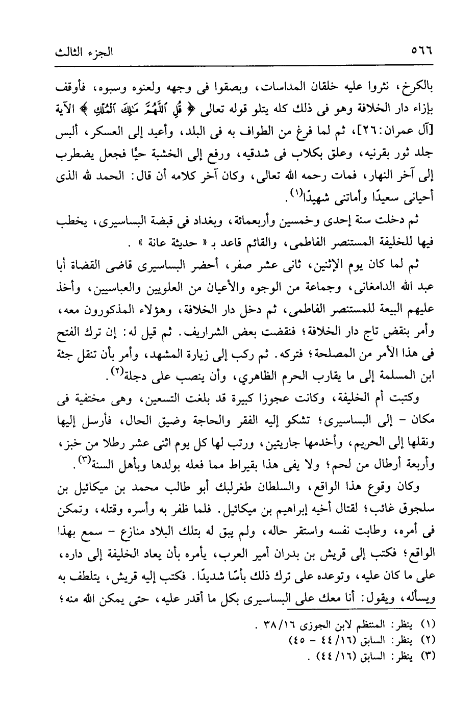 بالكرخ نثروا عَلَيْهِ خلقان المداسات وبصقوا فِي وَجهه ولعنوه وسبوه فَأوقف بازاء دَار الْخلَافَة وَهُوَ فِي ذَلِك كُله يَتْلُو قَوْله تَعَالَى {قُلِ اَللَهُمَ ماَلِكَ اَلملك} الْآيَة آل عمرَان 26 ثمَّ لما فرغ من الطّواف بِهِ فِي الْبَلَد وأعيد إِلَى الْعَسْكَر ألبس جلد ثَوْر بقرنيه وعلق بكلاب فِي شدقيه وَرفع إِلَى الْخَشَبَة حَيا فَجعل يضطرب إِلَى آخر النَّهَار فَمَاتَ رَحمَه الله تَعَالَى وَكَانَ آخر كَلَامه أَن قَالَ الْحَمد لله الَّذِي أحياني سعيداً وأماتني شَهِيدا ثمَّ دخلت سنة إِحْدَى وَخمسين وَأَرْبَعمِائَة وبغداد فِي قَبْضَة البساسيري يخْطب فِيهَا للخليفة الْمُسْتَنْصر الفاطمي والقائم قَاعد ب حَدِيثَة عانة ثمَّ لما كَانَ يَوْم الِاثْنَيْنِ ثَانِي عشر صفر أحضر البساسيري قَاضِي الْقُضَاة أَبَا عبد الله الدَّامغَانِي وَجَمَاعَة من الْوُجُوه والأعيان من العلويين والعباسيين وَأخذ عَلَيْهِم الْبيعَة للمستنصر الفاطمي ثمَّ دخل دَار الْخلَافَة وَهَؤُلَاء المذكورون مَعَه وَأمر بِنَقْض تَاج دَار الْخلَافَة فنقضت بعض الشراريف ثمَّ قيل لَهُ إِن ترك الْفَتْح فِي هَذَا الْأَمر من الْمصلحَة فَتَركه ثمَّ ركب إِلَى زِيَارَة المشهد وَأمر بِأَن تنقل جثة ابْن الْمسلمَة إِلَى مَا يُقَارب الْحرم الظَّاهِرِيّ وَأَن ينصب على دجلة وكتبت أم الْخَلِيفَة وَكَانَت عجوزاً كَبِيرَة قد بلغت التسعين وَهِي مختفية فِي مَكَان إِلَى البساسيري تَشْكُو إِلَيْهِ الْفقر وَالْحَاجة وضيق الْحَال فَأرْسل إِلَيْهَا ونقلها إِلَى الْحَرِيم وأخدمها جاريتين ورتب لَهَا كل يَوْم اثْنَي عشر رطلا من خبز وَأَرْبَعَة أَرْطَال من لحم وَلَا يَفِي هَذَا بقيراط مِمَّا فعله بِوَلَدِهَا وبأهل السّنة وَكَانَ وُقُوع هَذَا الْوَاقِع وَالسُّلْطَان طغرلبك أَبُو طَالب مُحَمَّد بن مِيكَائِيل بن سلجوق غَائِب لقِتَال أَخِيه إِبْرَاهِيم بن مِيكَائِيل فَلَمَّا ظفر بِهِ وأسره وَقَتله وَتمكن فِي أمره وَطَابَتْ نَفسه وَاسْتقر حَاله وَلم يبْق لَهُ بِتِلْكَ الْبِلَاد مُنَازع سمع بِهَذَا الْوَاقِع فَكتب إِلَى قُرَيْش بن بدران أَمِير الْعَرَب يَأْمُرهُ بِأَن يُعَاد الْخَلِيفَة إِلَى دَاره على مَا كَانَ عَلَيْهِ وتوعده على ترك ذَلِك بَأْسا شَدِيدا فَكتب إِلَيْهِ قُرَيْش يتلطف بِهِ ويسأله وَيَقُول أَنا مَعَك على البساسيري بِكُل مَا أقدر عَلَيْهِ حَتَّى يُمكن الله مِنْهُ