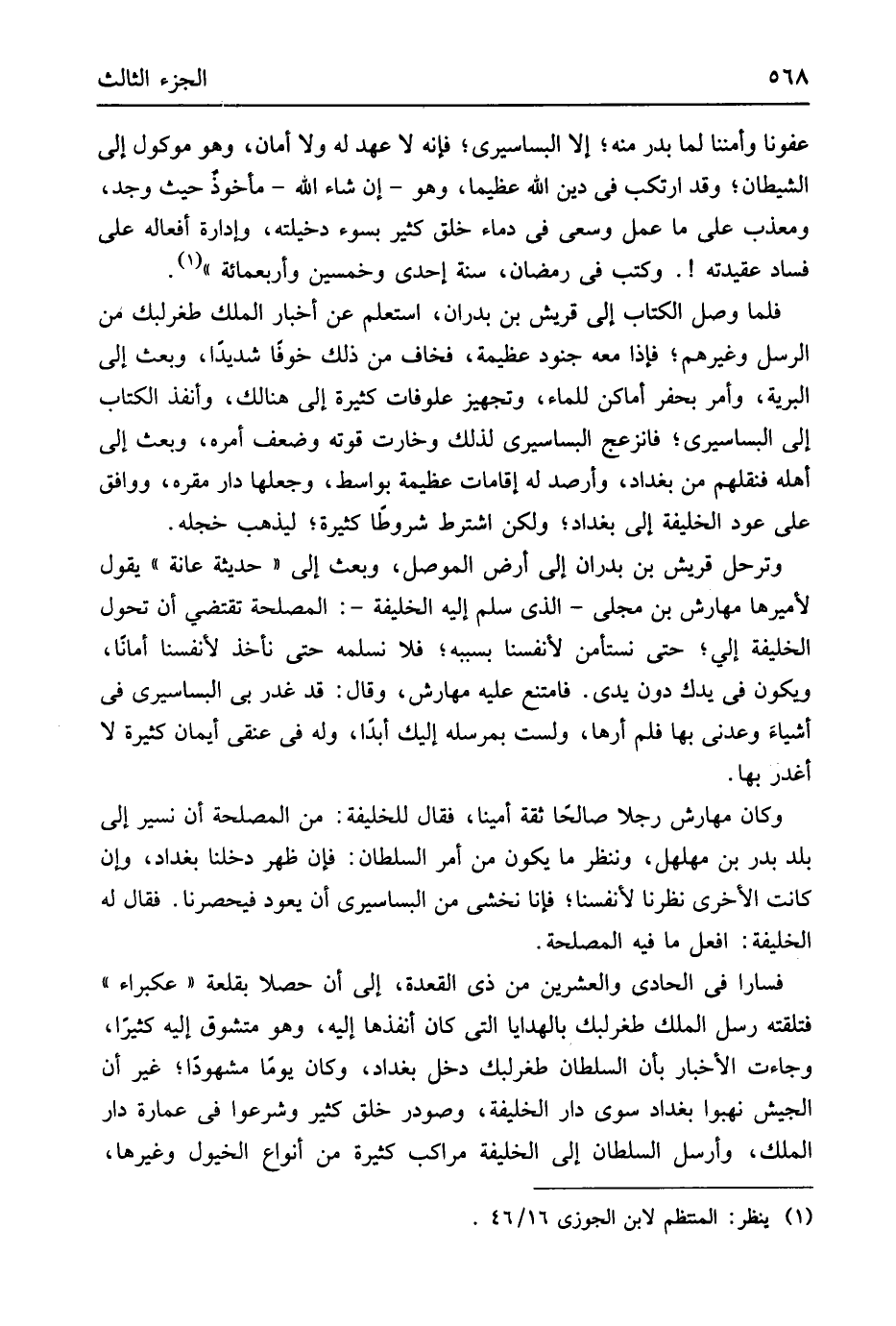 عَفَوْنَا وأمننا لما بدر مِنْهُ إِلَّا البساسيري فَإِنَّهُ لَا عهد لَهُ وَلَا أَمَان وَهُوَ موكول إِلَى الشَّيْطَان وَقد ارْتكب فِي دين الله عَظِيما وَهُوَ إِن شَاءَ الله مَأْخُوذ حَيْثُ وجد ومعذب على مَا عمل وسعي فِي دِمَاء خلق كثير بِسوء دخيلته وإدارة أَفعاله على فَسَاد عقيدته وَكتب فِي رَمَضَان سنة إِحْدَى وَخمسين وَأَرْبَعمِائَة فَلَمَّا وصل الْكتاب إِلَى قُرَيْش بن بدران استعلم عَن أَخْبَار الْملك طغرلبك من الرُّسُل وَغَيرهم فَإِذا مَعَه جنود عَظِيمَة فخاف من ذَلِك خوفًا شَدِيدا وَبعث إِلَى الْبَريَّة وَأمر بِحَفر أَمَاكِن للْمَاء وتجهيز علوفات كَثِيرَة إِلَى هُنَالك وأنفذ الْكتاب إِلَى البساسيري فانزعج البساسيري لذَلِك وخارت قوته وَضعف أمره وَبعث إِلَى أَهله فنقلهم من بَغْدَاد وأرصد لَهُ إقامات عَظِيمَة بواسط وَجعلهَا دَار مقره وَوَافَقَ على عود الْخَلِيفَة إِلَى بَغْدَاد وَلَكِن اشْترط شُرُوطًا كَثِيرَة ليذْهب خجله وترحل قُرَيْش بن بدران إِلَى أَرض الْموصل وَبعث إِلَى حَدِيثَة عانة يَقُول لأميرها مهارش بن مجلي الَّذِي سلم إِلَيْهِ الْخَلِيفَة الْمصلحَة تَقْتَضِي أَن تحول الْخَلِيفَة إِلَيّ حَتَّى نستأمن لأنفسنا بِسَبَبِهِ فَلَا نسلمه حَتَّى نَأْخُذ لأنفسنا أَمَانًا وَيكون فِي يدك دون يَدي فَامْتنعَ عَلَيْهِ مهارش وَقَالَ قد غدر بِي البساسيري فِي أشياءَ وَعَدَني بهَا فَلم أرها وَلست بمرسله إِلَيْك أبدا وَله فِي عنقِي أَيْمَان كَثِيرَة لَا أغدر بهَا وَكَانَ مهارش رجلا صَالحا ثِقَة أَمينا فَقَالَ للخليفة من الْمصلحَة أَن نسير إِلَى بلد بدر بن مهلهل وَنَنْظُر مَا يكون من أَمر السُّلْطَان فَإِن ظهر دَخَلنَا بَغْدَاد وَإِن كَانَت الْأُخْرَى نَظرنَا لأنفسنا فَإنَّا نخشى من البساسيري أَن يعود فيحصرنا فَقَالَ لَهُ الْخَلِيفَة افْعَل مَا فِيهِ الْمصلحَة فسارا فِي الْحَادِي وَالْعِشْرين من ذِي الْقعدَة إِلَى أَن حصلا بقلعة عكبراء فَتَلَقَّتْهُ رسل الْملك طغرلبك بالهدايا الَّتِي كَانَ أنفذها إِلَيْهِ وَهُوَ متشوق إِلَيْهِ كثيرا وَجَاءَت الْأَخْبَار بِأَن السُّلْطَان طغرلبك دخل بَغْدَاد وَكَانَ يَوْمًا مشهودا غير أَن الْجَيْش نهبوا بَغْدَاد سوى دَار الْخَلِيفَة وصودر خلق كثير وشرعوا فِي عمَارَة دَار الْملك وَأرْسل السُّلْطَان إِلَى الْخَلِيفَة مراكب كَثِيرَة من أَنْوَاع الْخُيُول وَغَيرهَا