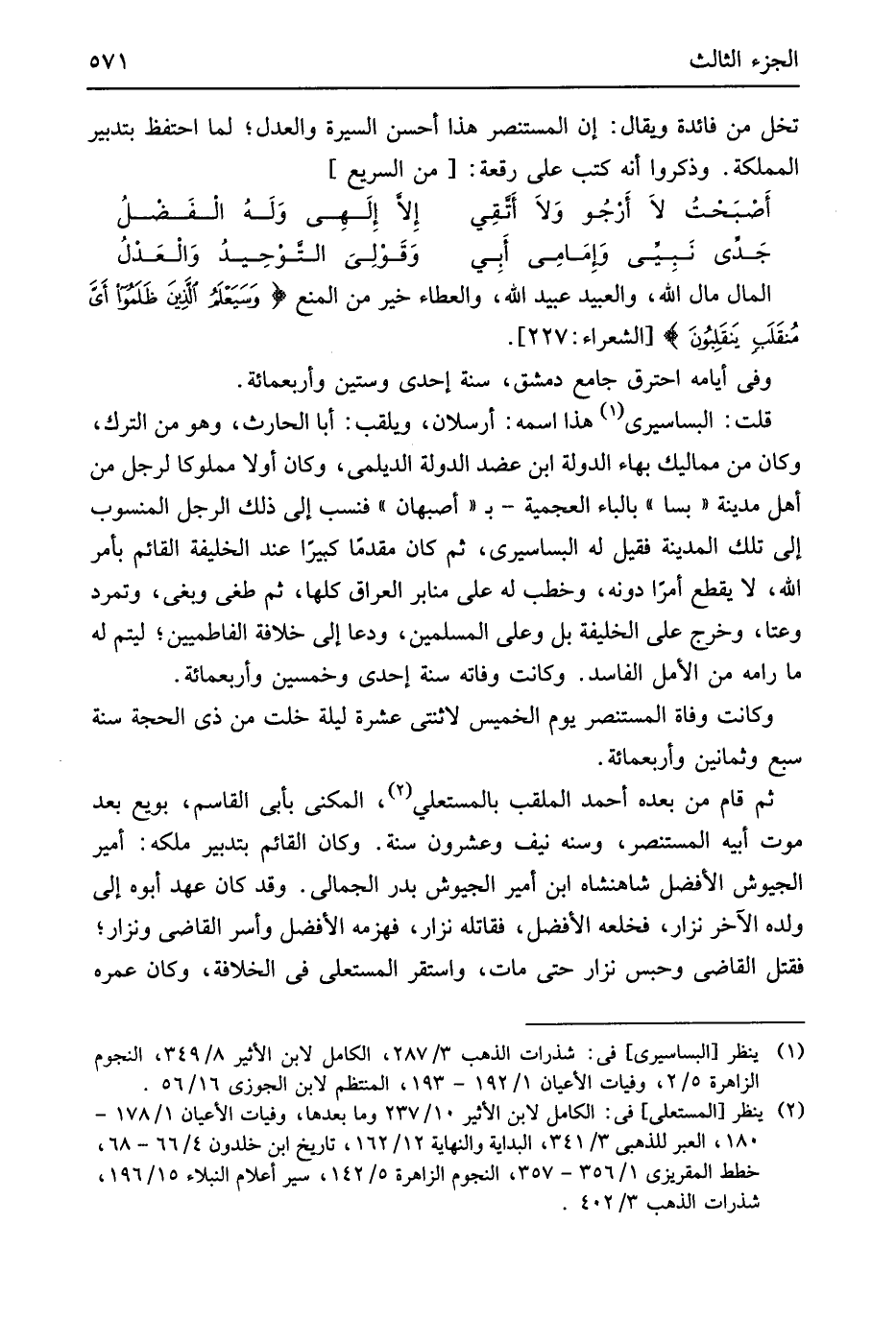 المَال مَال الله وَالْعَبِيد عبيد الله وَالعطَاء خير من الْمَنْع {وَسَيعلمُ اَلذينَ ظَلَمُوا أَيَّ مُنقَلَبِ يَنقَلِبوُن} الشُّعَرَاء 227 وَفِي أَيَّامه احْتَرَقَ دمشق سنة إِحْدَى وَسِتِّينَ وَأَرْبَعمِائَة قلت البساسيري هَذَا اسْمه أرسلان ويلقب أَبَا الْحَارِث وَهُوَ من التّرْك وَكَانَ من مماليك بهاء الدولة ابْن عضد الدولة الديلمي وَكَانَ أَولا مَمْلُوكا لرجل من أهل مَدِينَة بسا بِالْبَاء العجمية بأصبهان فنسب إِلَى ذَلِك الرجل الْمَنْسُوب إِلَى تِلْكَ الْمَدِينَة فَقيل لَهُ البساسيري ثمَّ كَانَ مقدما كَبِيرا عِنْد الْخَلِيفَة الْقَائِم بِأَمْر الله لَا يقطع أمرا دونه وخطب لَهُ على مَنَابِر الْعرَاق كلهَا ثمَّ طَغى وبغى وتمرد وعتا وَخرج على الْخَلِيفَة بل وعَلى الْمُسلمين ودعا إِلَى خلَافَة الفاطميين ليتم لَهُ مَا رامه من الأمل الْفَاسِد وَكَانَت وَفَاته سنة إِحْدَى وَخمسين وَأَرْبَعمِائَة وَكَانَت وَفَاة الْمُسْتَنْصر يَوْم الْخَمِيس لِاثْنَتَيْ عشرَة لَيْلَة خلت من ذِي الْحجَّة سنة سبع وَثَمَانِينَ وَأَرْبَعمِائَة ثمَّ قَامَ من بعده أَحْمد الملقب بالمستعلي المكنى بِأبي الْقَاسِم بُويِعَ بعد موت أَبِيه الْمُسْتَنْصر وسنه نَيف وَعِشْرُونَ سنة وَكَانَ الْقَائِم بتدبير ملكه أَمِير الجيوش الْأَفْضَل شاهنشاه ابْن أَمِير الجيوش بدر الجمالي وَقد كَانَ عهد أَبوهُ إِلَى وَلَده الآخر نزار فخلعه الْأَفْضَل فقاتله نزار فَهَزَمَهُ الْأَفْضَل وَأسر القَاضِي ونزار فَقتل القَاضِي وَحبس نزار حَتَّى مَاتَ وَاسْتقر المستعلي فِي الْخلَافَة وَكَانَ عمره