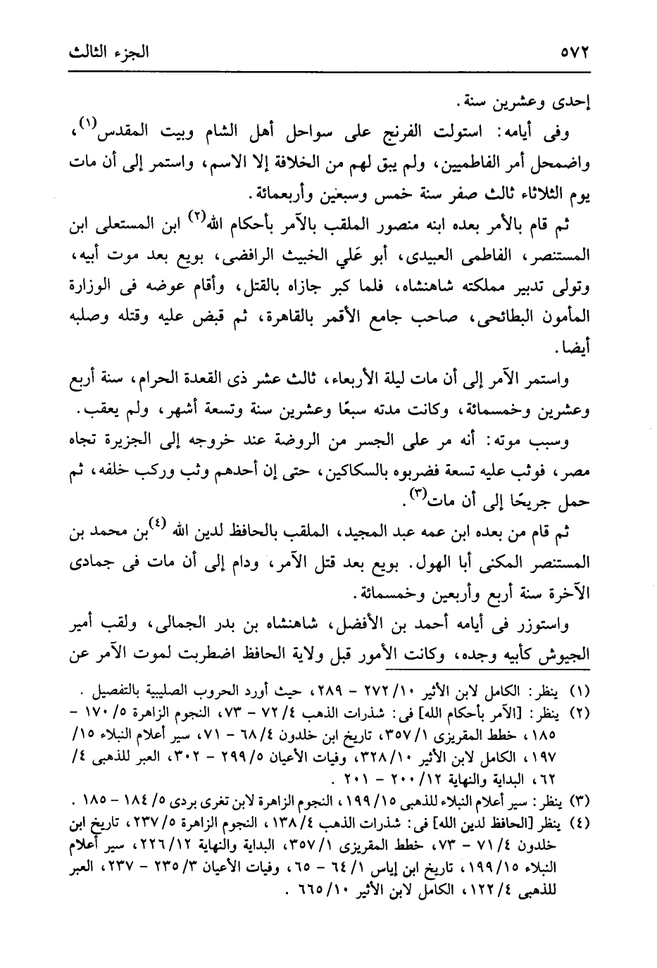 إِحْدَى وَعشْرين سنةَ وَفِي أَيَّامه استولت الفرنج على سواحل أهل الشَّام وَبَيت الْمُقَدّس واضمحل أَمر الفاطميين وَلم يبْق لَهُم من الْخلَافَة إِلَّا الِاسْم وَاسْتمرّ إِلَى أَن مَاتَ يَوْم الثُّلَاثَاء ثَالِث صفر سنة خمس وَسبعين وَأَرْبَعمِائَة ثمَّ قَامَ بِالْأَمر بعده ابْنه مَنْصُور الملقب بالآمر بِأَحْكَام الله ابْن المستعلي ابْن الْمُسْتَنْصر الفاطمي العبيدي أَبُو عَليّ الاخبيث الرافضي بُويِعَ بعد موت أَبِيه وَتَوَلَّى تَدْبِير مَمْلَكَته شاهنشاه فَلَمَّا كبر جازاه بِالْقَتْلِ وَأقَام عوضه فِي الوزارة الْمَأْمُون البطائحي صَاحب جَامع الْأَقْمَر بِالْقَاهِرَةِ ثمَّ قبض عَلَيْهِ وَقَتله وصلبه أَيْضا وَاسْتمرّ الْآمِر إِلَى أَن مَاتَ لَيْلَة الْأَرْبَعَاء ثَالِث عشر ذِي الْقعدَة الْحَرَام سنة أَربع وَعشْرين وَخَمْسمِائة وَكَانَت مدَّته سبعا وَعشْرين سنة وَتِسْعَة أشهر وَلم يعقب وَسبب مَوته أَنه مر على الجسر من الرَّوْضَة عِنْد خُرُوجه إِلَى الجزيرة تجاه مصر فَوَثَبَ عَلَيْهِ تِسْعَة فضربوه بالسكاكين حَتَّى إِن أحدهم وثب وَركب خَلفه ثمَّ حمل جريحاً إِلَى أَن مَاتَ ثمَّ قَامَ من بعده ابْن عَمه عبد الْمجِيد الملقب بِالْحَافِظِ لدين الله بن مُحَمَّد بن الْمُسْتَنْصر المكنى أَبَا الهول بُويِعَ بعد قتل الْآمِر ودام إِلَى أَن مَاتَ فِي جُمَادَى الْآخِرَة سنة أَربع وَأَرْبَعين وَخَمْسمِائة واستوزر فِي أَيَّامه أَحْمد بن الْأَفْضَل شاهنشاه بن بدر الجمالي ولقب أَمِير الجيوش كأبيه وجده وَكَانَت الْأُمُور قبل ولَايَة الْحَافِظ اضْطَرَبَتْ لمَوْت الْآمِر عَن
