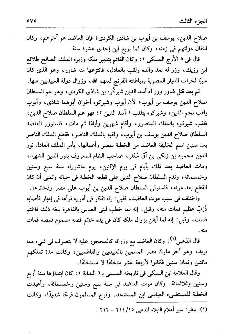 صَلَاح الدّين يُوسُف بن أَيُّوب بن شاذي الْكرْدِي فَإِن العاضد هُوَ اَخرهم وَكَانَ انْتِقَال دولتهم فِي زَمَنه وَكَانَ لما بُويِعَ ابْن إِحْدَى عشرَة سنة قَالَ فِي الأرج المسكي وَكَانَ الْقَائِم بتدبير ملكه وزيره الْملك الصَّالح طلائع ابْن رزيك وزر لَهُ بعد وَالِده ولقب بالعادل فانتزعها مِنْهُ شاور وَهُوَ الَّذِي كَانَ سَببا لخراب الديار المصرية بمباطنته الفرنج لعنهم الله وَزَوَال دولة العبيديين مِنْهَا ثمَّ بعد قتل شاور وزر لَهُ أَسد الدّين شيركُوه بن شاذي الْكرْدِي وَهُوَ عَم السُّلْطَان صَلَاح الدّين يُوسُف بن أَيُّوب لِأَن أَيُّوب وشيركوه أَخَوان أَبوهُمَا شاذي وَأَيوب يلقب نجم الدّين وشيركوه يتلقب أَسد الدّين فَهُوَ عَم السُّلْطَان صَلَاح الدّين فلقب شيركوه بِالْملكِ الْمَنْصُور وَأقَام شَهْرَيْن وأياماً ثمَّ مَاتَ فاستوزر العاضد السُّلْطَان صَلَاح الدّين يُوسُف بن أَيُّوب ولقبه بِالْملكِ النَّاصِر فَقطع الْملك النَّاصِر بعد سِنِين اسْم الْخَلِيفَة العاضد من الْخطْبَة بِمصْر وأعمالها بِأَمْر الْملك الْعَادِل نور الدّين مَحْمُود بن زنكي بن آق سُنقر صَاحب الشَّام الْمَعْرُوف بِنور الدّين الشَّهِيد وَمَات العاضد بعد ذَلِك بأيام فِي يَوْم الِاثْنَيْنِ يَوْم عَاشُورَاء سنة سبع وَسِتِّينَ وَخَمْسمِائة وَنَدم السُّلْطَان صَلَاح الدّين على قطعه الْخطْبَة فِي حَيَاته وَتمنى أَن كَانَ الْقطع بعد مَوته فاستولى السُّلْطَان صَلَاح الدّين بن أَيُّوب على مصر وذخائرها وَاخْتلف فِي سَبَب موت العاضد فَقيل إِنَّه تفكر فِي أُمُوره فرآها فِي إدبار فَأَصَابَهُ ذَرب عَظِيم فَمَاتَ مِنْهُ وَقيل إِنَّه لما خطب لبني الْعَبَّاس بِالْقَاهِرَةِ بلغه ذَلِك فَاغْتَمَّ فَمَاتَ وَقيل إِنَّه لما أَيقَن بِزَوَال ملكه كَانَ فِي يَده خَاتم فصه مَسْمُوم فمصه فَمَاتَ مِنْهُ قَالَ الذَّهَبِيّ وَكَانَ العاضد مَعَ وزرائه كالمحجور عَلَيْهِ لَا يتَصَرَّف فِي شَيْء مِمَّا يُرِيد وَهُوَ آخر مُلُوك مصر المسمين بالعبيديين الفاطميين وَكَانَت مُدَّة تملكهم مِائَتَيْنِ وثمان سِنِين فَكَانُوا لأربعة عشر مُتَخَلِّفًا لَا مستخلفاً وَقَالَ الْعَلامَة ابْن السُّبْكِيّ فِي تَارِيخه الْمُسَمّى بالبداية كَانَ ابْتِدَاؤُهَا سنة أَربع وَسِتِّينَ وثلاثمائة وَكَانَ مزت العاضد فِي سنة سبع وَسِتِّينَ وَخَمْسمِائة وأعيدت الْخطْبَة للمستضيء العباسي ابْن المستنجد وَفَرح الْمُسلمُونَ فَرحا شَدِيدا وَكَانَت