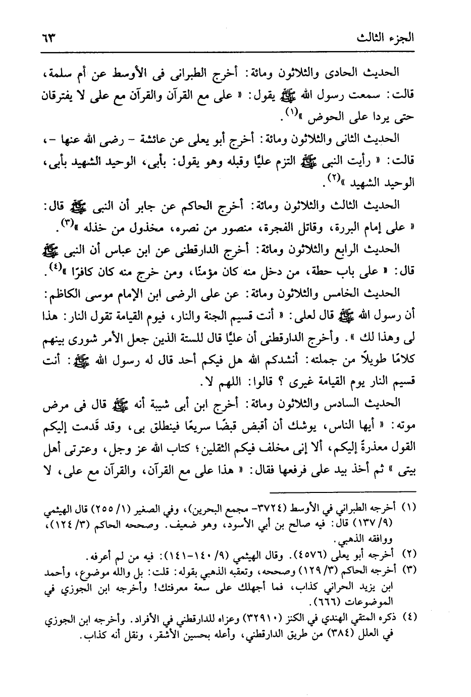 يَقُول عَليّ مَعَ الْقُرْآن وَالْقُرْآن مَعَ عَليّ لَا يفترقان حَتَّى يردا على الْحَوْض الحَدِيث الثَّانِي وَالثَّلَاثُونَ وَمِائَة أخرج أَبُو يعلى
