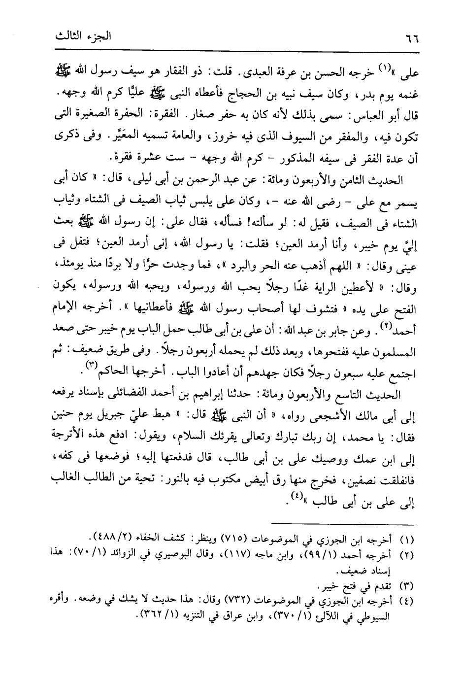 عليا كرم الله وَجهه قَالَ أَبُو الْعَبَّاس سمي بذلك لِأَنَّهُ كَانَ بِهِ حفر صغَار الْفَقْرَة الحفرة الصَّغِيرَة الَّتِي تكون فِيهِ والمفقر من السيوف الَّذِي فِيهِ خروز والعامة تسميه المعَير وَفِي ذكرى أَن عدَّة الْفقر فِي سَيْفه الْمَذْكُور كرم الله وَجهه سِتّ عشرَة فقرة الحَدِيث الثَّامِن وَالْأَرْبَعُونَ وَمِائَة