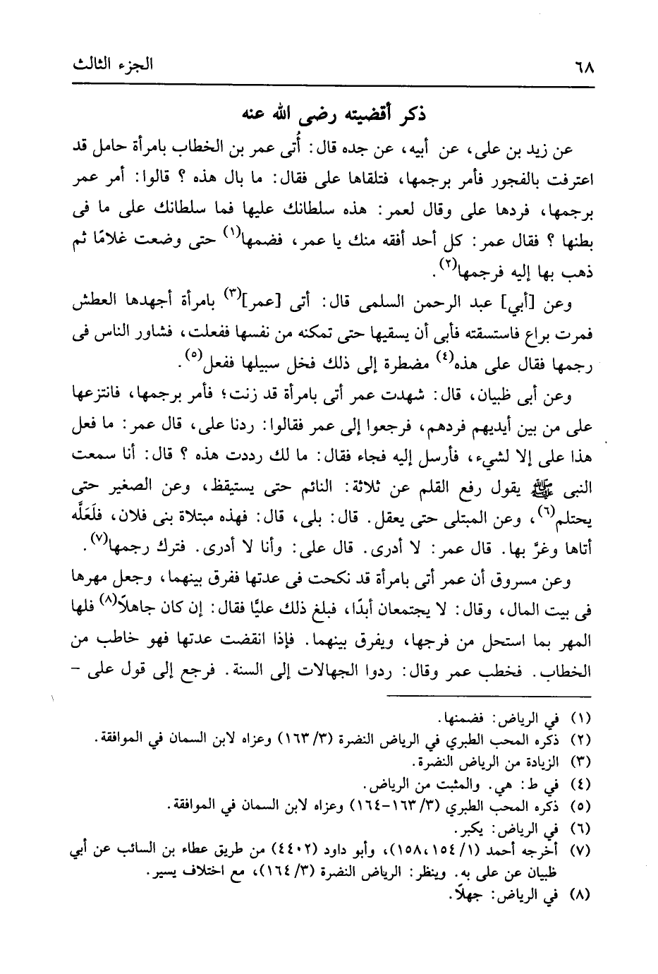 عَن زيد بن عَليّ عَن أَبِيه عَن جده قَالَ أَتَى عمر بن الْخطاب بِامْرَأَة حَامِل قد اعْترفت بِالْفُجُورِ فَأمر برجمها فتلقاها عَليّ فَقَالَ مَا بَال هَذِه قَالُوا أَمر عمر برجمها فَردهَا عَليّ وَقَالَ لعمر هَذِه سلطانك عَلَيْهَا فَمَا سلطانك على مَا فِي بَطنهَا فَقَالَ عمر كل أحد أفقه مِنْك يَا عمر فَضمهَا حَتَّى وضعت غُلَاما ثمَّ ذهب بهَا إِلَيْهِ فرجمها وَعَن أبي عبد الرَّحْمَن السّلمِيّ قَالَ أَتَى عمر بِامْرَأَة أجهدها الْعَطش فمرت براع فاستسقته فَأبى أَن يسقيها حَتَّى تمكنه من نَفسهَا فَفعلت فَشَاور النَّاس فِي رَجمهَا فَقَالَ عَليّ هَذِه مضطرة إِلَى ذَلِك فَخَل سَبِيلهَا فَفعل وَعَن أبي ظبْيَان قَالَ شهِدت عمر أَتَى بِامْرَأَة قد زنت فَأمر برجمها فانتزعها عَليّ من بَين أَيْديهم فردهم فَرَجَعُوا إِلَى عمر فَقَالُوا ردنا عَليّ قَالَ عمر مَا فعل هَذَا عَليّ إِلَّا لشَيْء فَأرْسل إِلَيْهِ فجَاء فَقَالَ مَا لَك رددت هَذِه قَالَ أَنا سَمِعت النَّبِي