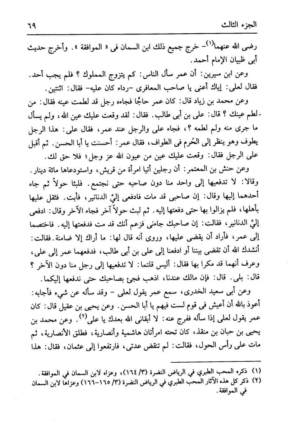 رَضِي الله عَنْهُمَا خرج جَمِيع ذَلِك ابْن السمان فِي الْمُوَافقَة وَأخرج حَدِيث أبي ظبْيَان الإِمَام أَحْمد وَعَن ابْن سِيرِين أَن عمر سَأَلَ النَّاس كم يتَزَوَّج الْمَمْلُوك فَلم يجب أحد فَقَالَ لعَلي إياك أَعنِي يَا صَاحب الْمعَافِرِي رِدَاء كَانَ عَلَيْهِ فَقَالَ اثْنَتَيْنِ وَعَن مُحَمَّد بن زِيَاد قَالَ كَانَ عمر حَاجا فَجَاءَهُ رجل قد لطمت عينه فَقَالَ من لطم عَيْنك قَالَ عَليّ بن أبي طَالب فَقَالَ لقد وَقعت عَلَيْك عين الله وَلم يسْأَل مَا جرى مِنْهُ وَلم لطمه فجَاء عَليّ وَالرجل عِنْد عمر فَقَالَ عَليّ هَذَا الرجل يطوف وَهُوَ ينظر إِلَى الحُرم فِي الطّواف فَقَالَ عمر أَحْسَنت يَا أَبَا الْحسن ثمَّ أقبل على الرجل فَقَالَ وَقعت عَلَيْك عين من عُيُون الله عز وَجل فَلَا حق لَك وَعَن حَنش بن الْمُعْتَمِر أَن رجلَيْنِ أَتَيَا امْرَأَة من قُرَيْش واستودعاها مائَة دِينَار وَقَالا لَا تدفعيها إِلَى وَاحِد منا دون صَاحبه حَتَّى نَجْتَمِع فلبثا حولا ثمَّ جَاءَ أَحدهمَا إِلَيْهَا وَقَالَ إِن صَاحِبي قد مَاتَ فادفعي إليَ الدَّنَانِير فَأَبت فثقل عَلَيْهَا بِأَهْلِهَا فَلم يزَالُوا بهَا حَتَّى دفعتها إِلَيْهِ ثمَّ لبث حولاَ آخر فجَاء الآخر وَقَالَ ادفعي إِلَيّ الدَّنَانِير فَقَالَت إِن صَاحبك جَاءَنِي فَزعم أَنَّك قد مت فدفعتها إِلَيْهِ فاختصما إِلَى عمر فَأَرَادَ أَن يقْضِي عَلَيْهَا وروى أَنه قَالَ لَهَا مَا أَرَاك إِلَّا ضامنة فَقَالَت أنْشدك الله أَن تقضي بَيْننَا أَو ادفعنا إِلَى عَليّ بن أبي طَالب فدفعهما عمر إِلَى عَليّ وَعرف أَنَّهُمَا قد مكرا بهَا فَقَالَ أَلَيْسَ قلتما لَا تدفعيها إِلَى رجل منا دون الآخر قَالَ بلَى قَالَ فَإِن مَالك عندنَا اذْهَبْ فجيء بصاحبك حَتَّى ندفعها إلَيْكُمَا وَعَن أبي سعيد الْخُدْرِيّ سمع عمر يَقُول لعَلي وَقد سَأَلَهُ عَن شَيْء فَأَجَابَهُ أعوذ بِاللَّه أَن أعيش فِي قوم لست فيهم يَا أَبَا الْحسن وَعَن يحيى بن عقيل قَالَ كَانَ عمر يَقُول لعَلي إِذا سَأَلَهُ فَفرج عَنهُ لَا أبقاني الله بعْدك يَا عَليّ وَعَن مُحَمَّد بن يحيى بن حبَان بن منقذ كَانَ تَحْتَهُ امْرَأَتَانِ هاشمية وأنصارية فَطلق الْأَنْصَارِيَّة ثمَّ مَاتَ على رَأس الْحول فَقَالَت لم تنقض عدتي فَارْتَفعُوا إِلَى عُثْمَان فَقَالَ هَذَا