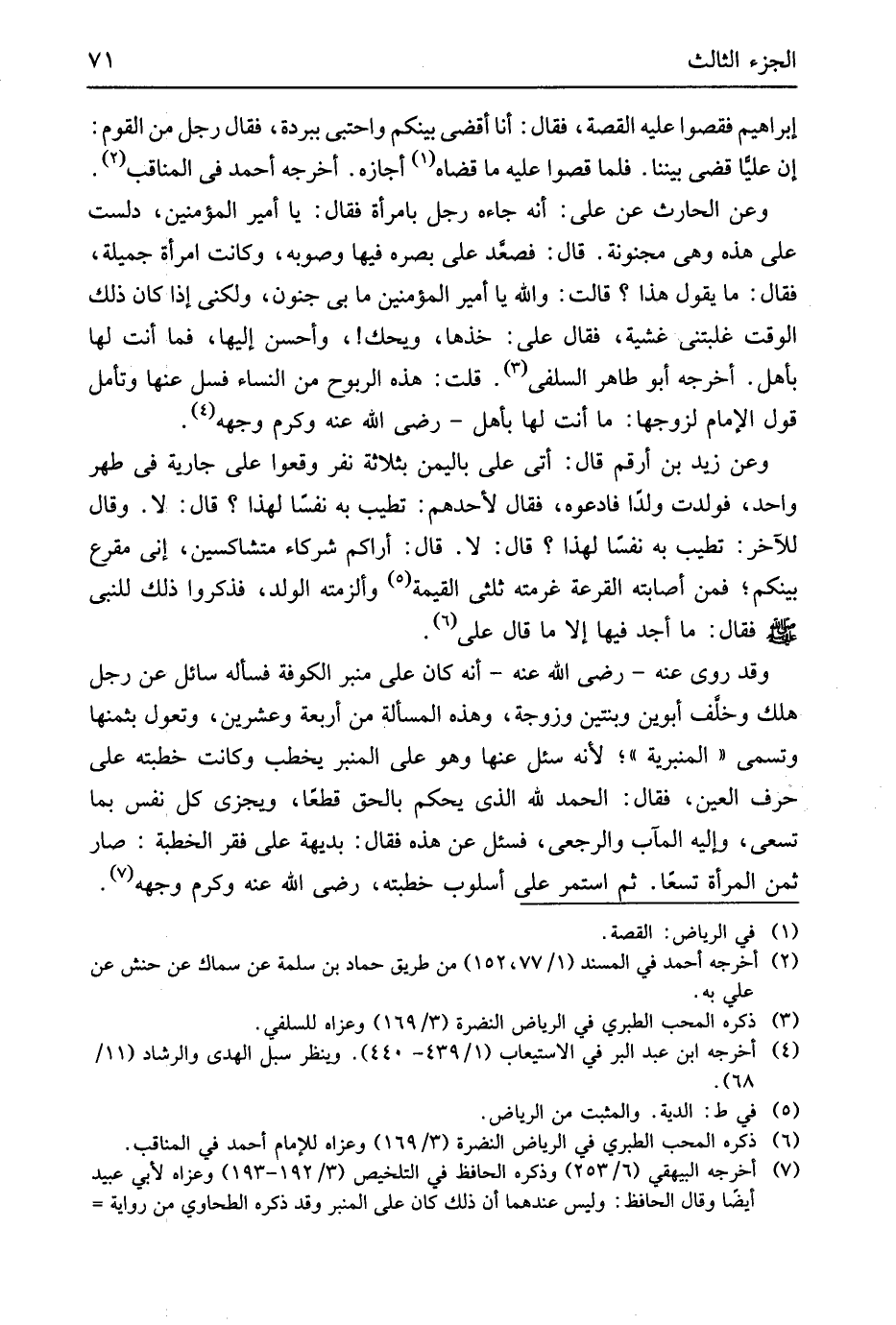إِبْرَاهِيم فقصوا عَلَيْهِ الْقِصَّة فَقَالَ أَنا أَقْْضِي بَيْنكُم واحتبي بِبُرْدَةٍ فَقَالَ رجل من الْقَوْم إِن عليا قضى بَيْننَا فَلَمَّا قصوا عَلَيْهِ مَا قَضَاهُ أجَازه أخرجه أَحْمد فِي المناقب وَعَن الْحَارِث عَن عَليّ أَنه جَاءَهُ رجل بِامْرَأَة فَقَالَ يَا أَمِير الْمُؤمنِينَ دلست على هَذِه وَهِي مَجْنُونَة قَالَ فَصَعدَ على بَصَره فِيهَا وَصَوَّبَهُ وَكَانَت امْرَأَة جميلَة فَقَالَ مَا يَقُول هَذَا قَالَت وَالله يَا أَمِير الْمُؤمنِينَ مَا بِي جُنُون وَلَكِنِّي إِذا كَانَ ذَلِك الْوَقْت غلبتني غشية فَقَالَ عَليّ خُذْهَا وَيحك وَأحسن إِلَيْهَا فَمَا أَنْت لَهَا بِأَهْل أخرجه أَبُو طَاهِر السلَفِي قلت هَذِه الربوح من النِّسَاء فسل عَنْهَا وَتَأمل قَول الإِمَام لزَوجهَا مَا أَنْت لَهَا بِأَهْل رَضِي الله عَنهُ وكرم وَجهه وَعَن زيد بن أَرقم قَالَ أَتَى على بِالْيمن بِثَلَاثَة نفر وَقَعُوا على جَارِيَة فِي طهر وَاحِد فَولدت ولدا فَادعوهُ فَقَالَ لأَحَدهم تطيب بِهِ نفسا لهَذَا قَالَ لَا وَقَالَ للْآخر تطيب بِهِ نفسا لهَذَا قَالَ لَا قَالَ أَرَاكُم شُرَكَاء متشاكسين إِنِّي مقرع بَيْنكُم فَمن أَصَابَته الْقرعَة غرمته ثُلثي الْقيمَة وألزمته الْوَلَد فَذكرُوا ذَلِك للنَّبِي