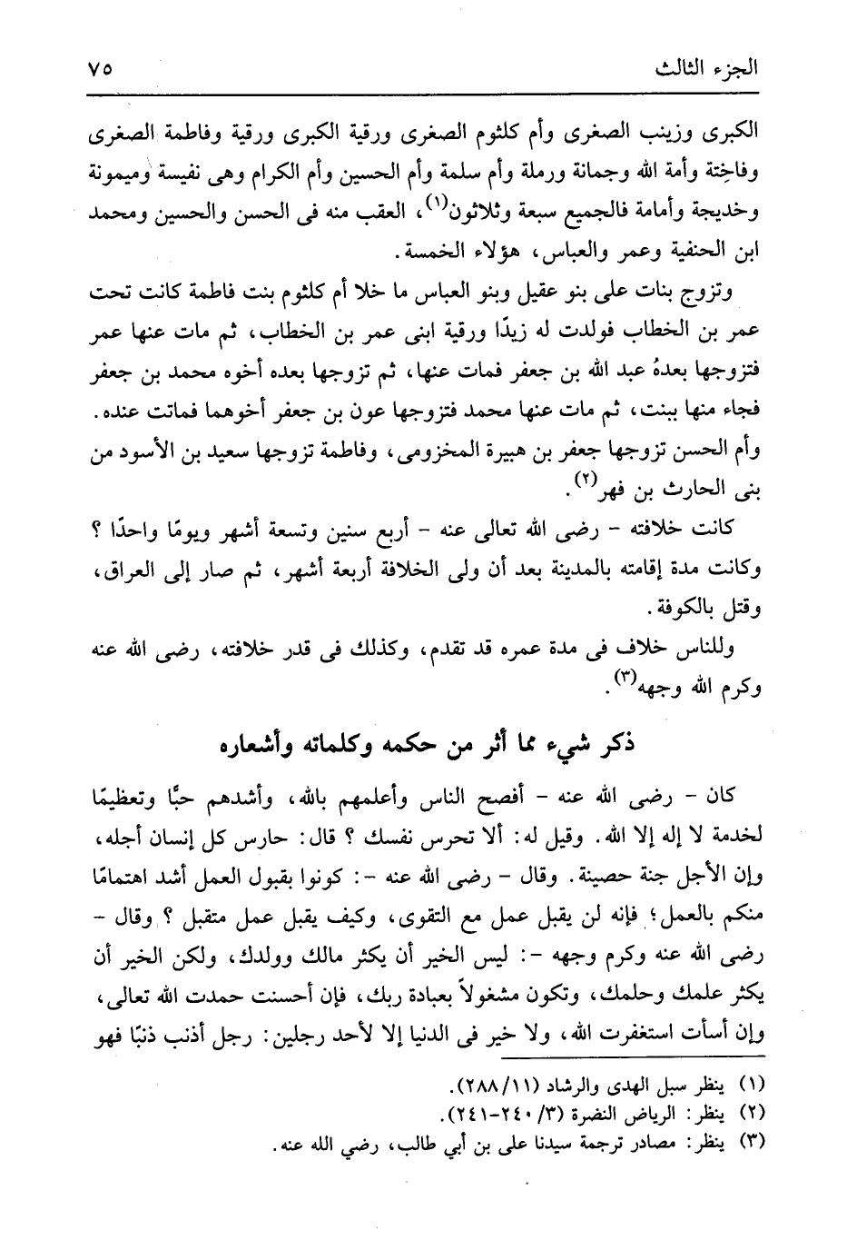 الْكُبْرَى وَزَيْنَب الصُّغْرَى وَأم كُلْثُوم الصُّغْرَى ورقية الْكُبْرَى ورقية وَفَاطِمَة الصُّغْرَى وفاخِتة وَأمة الله وجمانة ورملة وَأم سَلمَة وَأم الْحُسَيْن وَأم الْكِرَام وَهِي نفيسة ومَيْمُونَة وَخَدِيجَة وأمامة فالجميع سَبْعَة وَثَلَاثُونَ الْعقب مِنْهُ فِي الْحسن وَالْحُسَيْن وَمُحَمّد ابْن الْحَنَفِيَّة وَعمر وَالْعَبَّاس هَؤُلَاءِ الْخَمْسَة وَتزَوج بَنَات عَليّ بَنو عقيل وَبَنُو الْعَبَّاس مَا خلا أم كُلْثُوم بنت فَاطِمَة كَانَت تَحت عمر بن الْخطاب فَولدت لَهُ زيدا ورقية ابْني عمر بن الْخطاب ثمَّ مَاتَ عَنْهَا عمر فَتَزَوجهَا بعدهُ عبد الله بن جَعْفَر فَمَاتَ عَنْهَا ثمَّ تزَوجهَا بعده أَخُوهُ مُحَمَّد بن جَعْفَر فجَاء مِنْهَا ببنت ثمَّ مَاتَ عَنْهَا مُحَمَّد فَتَزَوجهَا عون بن جَعْفَر أخوهما فَمَاتَتْ عِنْده وَأم الْحسن تزَوجهَا جَعْفَر بن هُبَيْرَة المَخْزُومِي وَفَاطِمَة تزَوجهَا سعيد بن الْأسود من بني الْحَارِث بن فهر كَانَت خِلَافَته رَضِي الله تَعَالَى عَنهُ أَربع سِنِين وَتِسْعَة أشهر وَيَوْما وَاحِدًا وَكَانَت مُدَّة إِقَامَته بِالْمَدِينَةِ بعد أَن ولي الْخلَافَة أَرْبَعَة أشهر ثمَّ صَار إِلَى الْعرَاق وَقتل بِالْكُوفَةِ وَلِلنَّاسِ خلاف فِي مُدَّة عمره قد تقدم وَكَذَلِكَ فِي قدر خِلَافَته رَضِي الله عَنهُ وكرم الله وَجهه