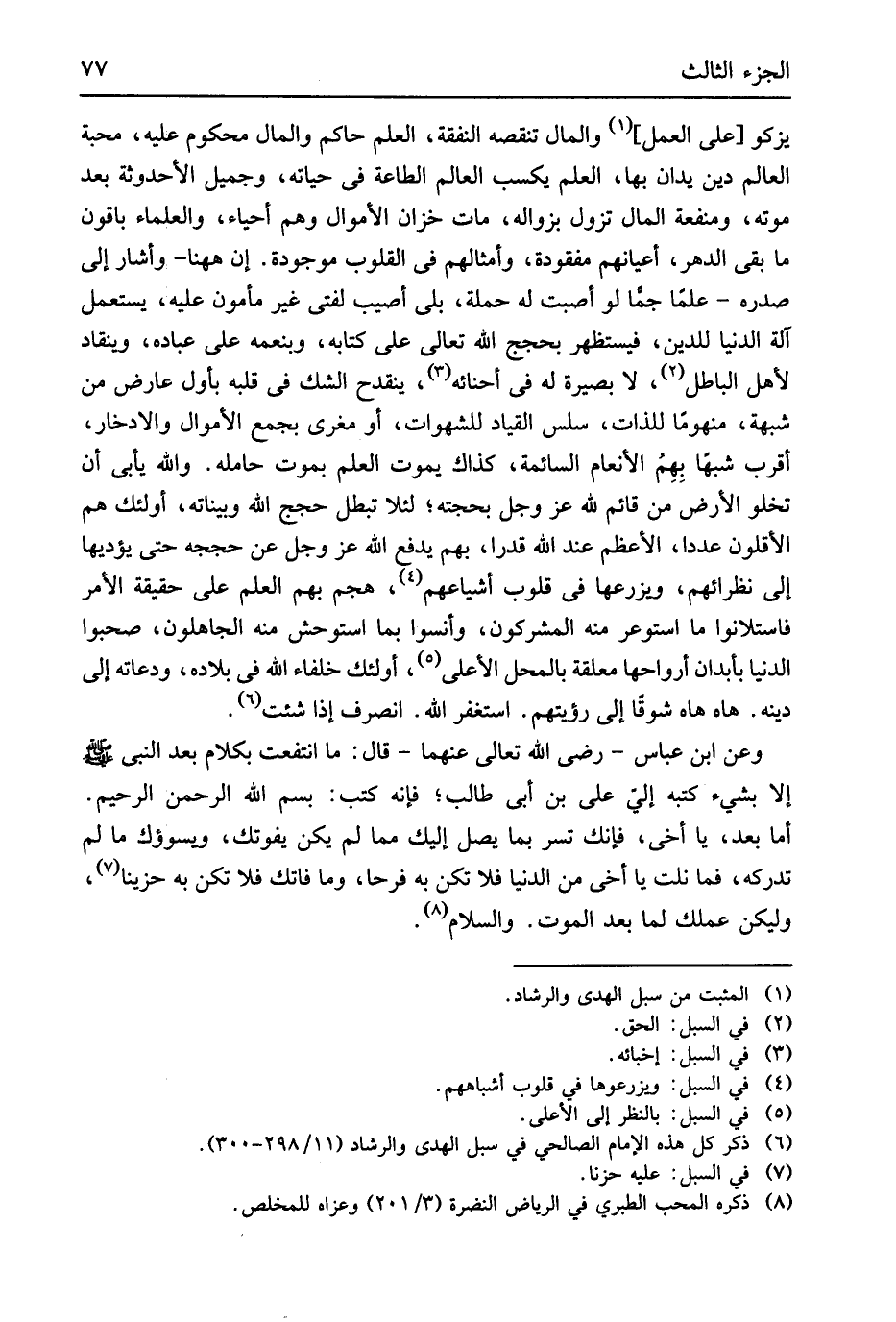 يزكو على الْعَمَل وَالْمَال تنقصه النَّفَقَة الْعلم حَاكم وَالْمَال مَحْكُوم عَلَيْهِ محبَّة الْعَالم دين يدان بهَا الْعلم يكْسب الْعَالم الطَّاعَة فِي حَيَاته وَجَمِيل الأحدوثة بعد مَوته وَمَنْفَعَة المَال تَزُول بزواله مَاتَ خزان الْأَمْوَال وهم أَحيَاء وَالْعُلَمَاء باقون مَا بَقِي الدَّهْر أعيانهم مفقودة وأمثالهم فِي الْقُلُوب مَوْجُودَة إِن هَهُنَا وَأَشَارَ إِلَى صَدره علما جماً لَو أصبت لَهُ حَملَة بلَى أُصِيب لفتى غير مَأْمُون عَلَيْهِ يسْتَعْمل آلَة الدُّنْيَا للدّين فيستظهر بحجج الله تَعَالَى على كِتَابه وبنعمه على عباده وينقاد لأهل الْبَاطِل لَا بَصِيرَة لَهُ فِي أحنائه ينقدح الشَّك فِي قلبه بِأول عَارض من شُبْهَة منهوماً للذات سَلس القياد للشهوات أَو مغرى بِجمع الْأَمْوَال والادخار أقرب شبها بِهِمُ الْأَنْعَام السَّائِمَة كَذَاك يَمُوت الْعلم بِمَوْت حامله وَالله يَأْبَى أَن تَخْلُو الأَرْض من قَائِم لله عز وَجل بحجته لِئَلَّا تبطل حجج الله وبيناته أُولَئِكَ هم الأقلون عددا الْأَعْظَم عِنْد الله قدرا بهم يدْفع الله عز وَجل عَن حججه حَتَّى يُؤَدِّيهَا إِلَى نظرائهم ويزرعها فِي قُلُوب أشياعهم هجم بهم الْعلم على حَقِيقَة الْأَمر فاستلانوا مَا استوعر مِنْهُ الْمُشْركُونَ وأنسوا بِمَا استوحش مِنْهُ الجاهلون صحبوا لدُنْيَا بأبدان أرواحها معلقَة بِالْمحل الْأَعْلَى أُولَئِكَ خلفاء الله فِي بِلَاده ودعاته إِلَى دينه هاه هاه شوقاً إِلَى رُؤْيَتهمْ اسْتغْفر الله انْصَرف إِذا شِئْت وَعَن ابْن عَبَّاس رَضِي لله تَعَالَى عَنْهُمَا قَالَ مَا انتفعت بِكَلَام بعد النَّبِي