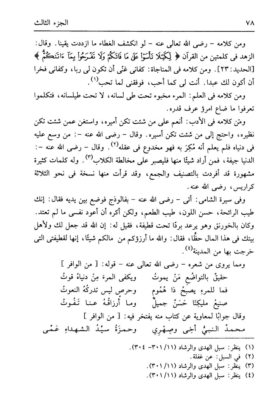 وَمن كَلَامه رَضِي الله تَعَالَى عَنهُ لَو انْكَشَفَ الغطاء مَا ازددت يَقِينا وَقَالَ الزّهْد فِي كَلِمَتَيْنِ من الْقُرْآن {لِكيلا تأسوا عَلىَ مَا فَاتَكُم وَلا تَفرحوا بِمَا آتَاكُم} الْحَدِيد 23 وَمن كَلَامه فِي الْمُنَاجَاة كفاني غنى أَن تكون لي رَبًّا وكفاني فخراً أَن أكون لَك عبدا وَأَنت لي كَمَا أحب فوفقني لما تحب وَمن كَلَامه فِي الْعلم الْمَرْء مخبوء تَحت طي لِسَانه لَا تَحت طيلسانه فتكلموا تعرفوا مَا ضَاعَ امْرُؤ عرف قدره وَمن كَلَامه فِي الْأَدَب أنعم على من شِئْت تكن أميره واستغن عَمَّن شِئْت تكن نَظِيره وَاحْتج إِلَى من شِئْت تكن أسيره وَقَالَ رَضِي الله عَنهُ من وسع عَلَيْهِ فِي دُنْيَاهُ فَلم يعلم أَنه مُكِرَ بِهِ فَهُوَ مخدوع فِي عقله وَقَالَ رَضِي الله عَنهُ الدُّنْيَا جيفة فَمن أَرَادَ شَيْئا مِنْهَا فليصبر على مُخَالطَة الْكلاب وَله كَلِمَات كَثِيرَة مَشْهُورَة قد أفردت بالتصنيف وَالْجمع وَقد قَرَأت مِنْهَا نُسْخَة فِي نَحْو الثَّلَاثَة كراريس رَضِي الله عَنهُ وَفِي سيرة الشَّامي أَتَى رَضِي الله عَنهُ بالفالوذج فَوضع بَين يَدَيْهِ فَقَالَ إِنَّك طيب الرَّائِحَة حسن اللَّوْن طيب الطّعْم وَلَكِن أكره أَن أَعُود نَفسِي مَا لم تَعْتَد وَكَانَ بالخورنق وَهُوَ يرعد بردا تَحت قطيفة فَقيل لَهُ إِن الله قد جعل لَك وَلأَهل بَيْتك فِي هَذَا المَال حظاً فَقَالَ وَالله مَا أرزؤكم من مالكم شَيْئا إِنَّهَا لقطيفتي الَّتِي خرجت بهَا من الْمَدِينَة وَمِمَّا يرْوى من شعره رَضِي الله تَعَالَى عَنهُ قَوْله من // (الوافر) //