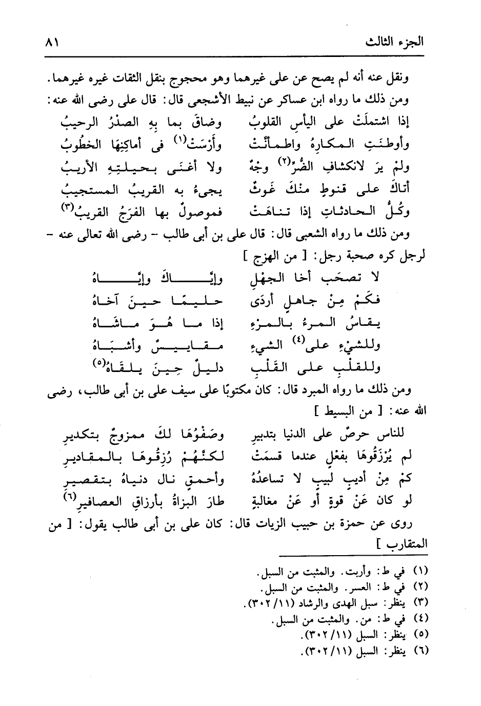 وَمن ذَلِك مَا رَوَاهُ الشّعبِيّ قَالَ قَالَ عَليّ بن أبي طَالب رَضِي الله تَعَالَى عَنهُ لرجل كره صُحْبَة رجل // (من الهزج) //