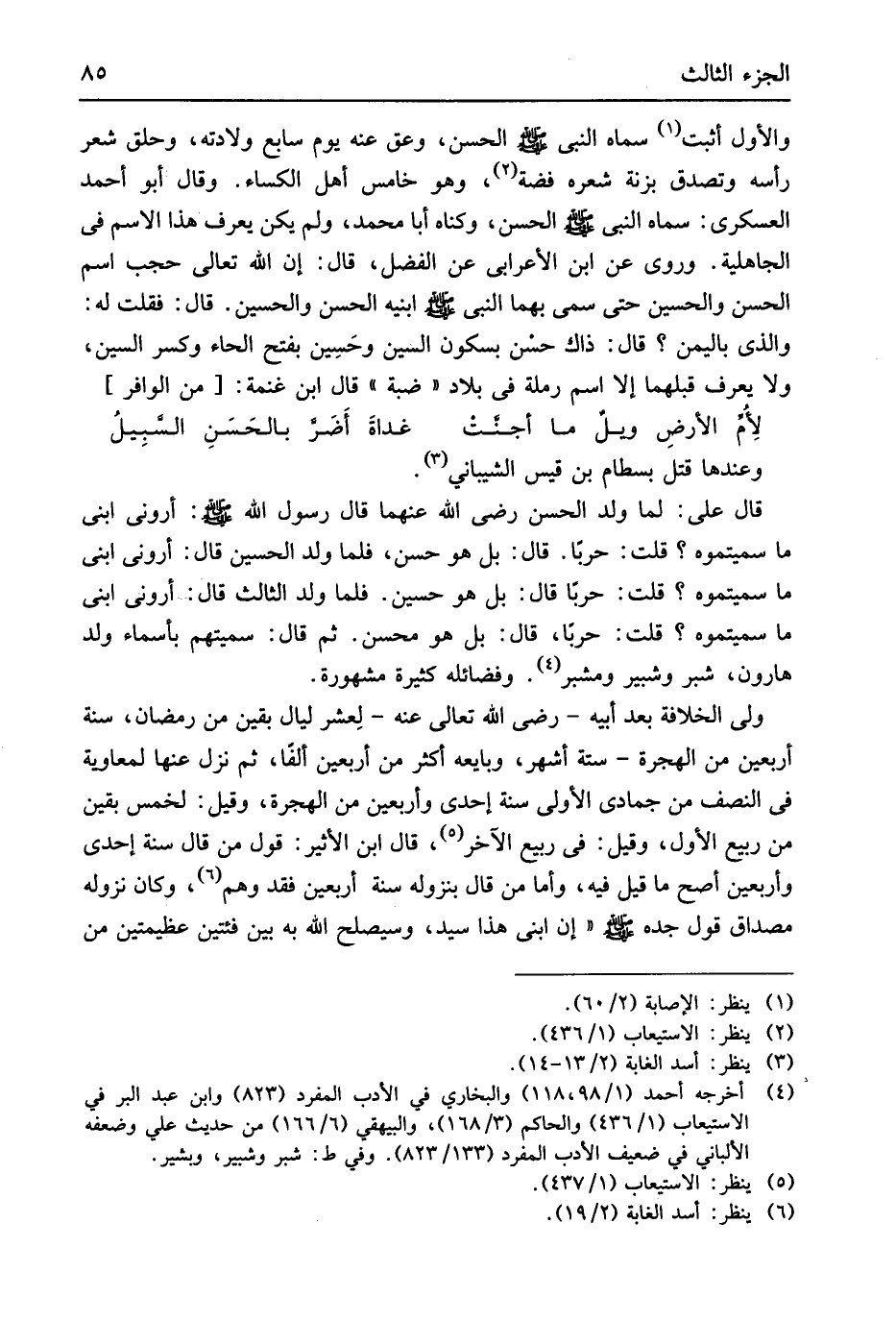 أروني ابْني مَا سميتموه قلت حَربًا قَالَ بل هُوَ حسن فَلَمَّا ولد الْحُسَيْن قَالَ أروني ابْني مَا سميتموه قلت حَربًا قَالَ بل هُوَ حُسَيْن فَلَمَّا ولد الثَّالِث قَالَ أروني ابْني مَا سميتموه قلت حَربًا قَالَ بل هُوَ حُسَيْن ثمَّ قَالَ سميتهم بأسماء ولد هَارُون شبر وشيبر ومشبر وفضائله كَثِيرَة مَشْهُورَة ولي الْخلَافَة بعد أَبِيه رَضِي الله تَعَالَى عَنهُ لِعشر لَيَال بَقينَ من رَمَضَان سنة أَرْبَعِينَ من الْهِجْرَة سِتَّة أشهر وَبَايَعَهُ أَكثر من أَرْبَعِينَ ألفَاً ثمَّ نزل عَنْهَا لمعاوية فِي النّصْف من جُمَادَى الأولى سنة إِحْدَى وَأَرْبَعين من الْهِجْرَة وَقيل لخمس بَقينَ من ربيع الأول وَقيل فِي ربيع الآخر قَالَ ابْن الْأَثِير قَول من قَالَ سنة إِحْدَى وَأَرْبَعين أصح مَا قيل فِيهِ وَأما من قَالَ فِي نُزُوله سنة أَرْبَعِينَ فقد وهم وَكَانَ نُزُوله مصداق قَول جده