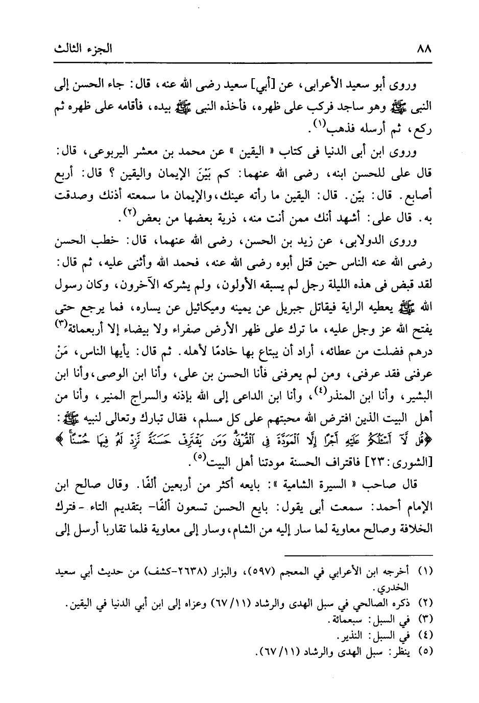 {قُل لَا أَسأَلكُم عليهِ أجرا إِلَّا المَودةَ فِي اَلقُربى وَمَن يَقتَرِف حسنَةَ نزد لَه فِيهَا حُسناً} الشورى 23 فاقتراف الْحَسَنَة مودتنا أهل الْبَيْت قَالَ صَاحب السِّيرَة الشامية بَايعه أَكثر من أَرْبَعِينَ ألفا وَقَالَ صَالح ابْن الإِمَام أَحْمد سَمِعت أبي يَقُول بَايع الْحسن تسعون ألفا بِتَقْدِيم التَّاء فَترك الْخلَافَة وَصَالح مُعَاوِيَة لما سَار إِلَيْهِ من الشَّام وَسَار إِلَى مُعَاوِيَة فَلَمَّا تقاربا أرسل إِلَى