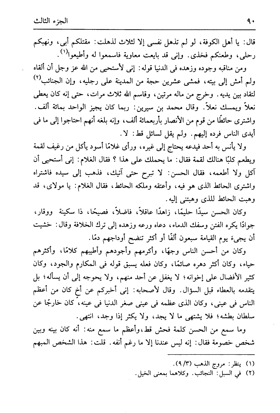 قَالَ يَا أهل الْكُوفَة لَو لم تذهل نَفسِي إِلَّا لثلاث لذهلت مقتلكم أبي ونهبكم رحلي وطعنكم فَخذي وَإِنِّي قد بَايَعت مُعَاوِيَة فَاسْمَعُوا لَهُ وَأَطيعُوا وَمن مناقبه وجوده وزهه فِي الدُّنْيَا قَوْله إِنِّي لأَسْتَحي من الله عز وَجل أَن أَلْقَاهُ وَلم أمش إِلَى بَيته فَمشى عشْرين حجَّة من لمدينة على رجلَيْهِ وَإِن الجنائب لتقاد بَين يَدَيْهِ وَخرج من مَاله مرَّتَيْنِ وقاسم الله ثَلَاث مَرَّات حَتَّى إِنَّه كَانَ يُعْطي نعلا ويمسك نعلا وَقَالَ مُحَمَّد بن سِيرِين رُبمَا كَانَ يُجِيز الْوَاحِد بِمِائَة ألف وَاشْترى حَائِطا من قوم من الْأَنْصَار بأربعمائة ألف وَإنَّهُ بلغه أَنهم احتاجوا إِلَى مَا فِي أَيدي النَّاس فَرده إِلَيْهِم وَلم يقل لسائل قطّ لَا وَلَا يأنس بِهِ أحد فيدعه يحْتَاج إِلَى غَيره وَرَأى غُلَاما أسود يَأْكُل من رغيف لقْمَة وَيطْعم كلبَاً هُنَالك لقْمَة فَقَالَ مَا يحملك على هَذَا فَقَالَ الْغُلَام إِنِّي أستحي أَن آكل وَلَا أطْعمهُ فَقَالَ الْحسن لَا تَبْرَح حَتَّى آتِيك فَذهب إِلَى سَيّده فَاشْتَرَاهُ وَاشْترى الْحَائِط الَّذِي هُوَ فِيهِ وَأعْتقهُ وَملكه الَحائط فَقَالَ الْغُلَام يَا مولَايَ قد وهبت الْحَائِط للَّذي وهبتني إِلَيْهِ وَكَانَ الْحسن سيداً حَلِيمًا زاهدَاً عاقلاَ فَاضلا فصيحَاً ذَا سكينَة ووقار جواداً يكره الْفِتَن وَسَفك الدِّمَاء دَعَاهُ ورعه وزهده إِلَى ترك الْخلَافَة وَقَالَ خشيت أَن يجئَ يَوْم الْقِيَامَة سَبْعُونَ ألفَاً أَو أَكثر تنضح أوداجهم دَمًا وَكَانَ من أحسن النَّاس وجهَاً وَأكْرمهمْ وأجودهم وأطيبهم كلَاما وَأَكْثَرهم حَيَاء وَكَانَ أَكثر دهره صَائِما وَكَانَ فعله يسْبق قَوْله فِي المكارم والجود وَكَانَ كثير الأفضال على إخوانه لَا يغْفل عَن أحد مِنْهُم وَلَا يحوجه إِلَى أَن يسْأَله بل يتَقَدَّم بالعطاء قبل السُّؤَال وَقَالَ لأَصْحَابه إِنِّي أخْبركُم عَن أخٍ كَانَ من أعظم النَّاس فِي عَيْني وَكَانَ الَّذِي عظمه فِي عَيْني صغر الدُّنْيَا فِي عينه كَانَ خَارِجا عَن سُلْطَان بطشه فَلَا يَشْتَهِي مَا لَا يجد وَلَا يكثر إِذا وجد انْتهى وَمَا سمع من الْحسن كلمة فحش قطّ وَأعظم مَا سمع مِنْهُ أَنه كَانَ بَينه وَبَين شخص خُصُومَة فَقَالَ إِنَّه لَيْسَ عندنَا إِلَّا مَا رغم أَنفه قلت هَذَا الشَّخْص الْمُبْهم