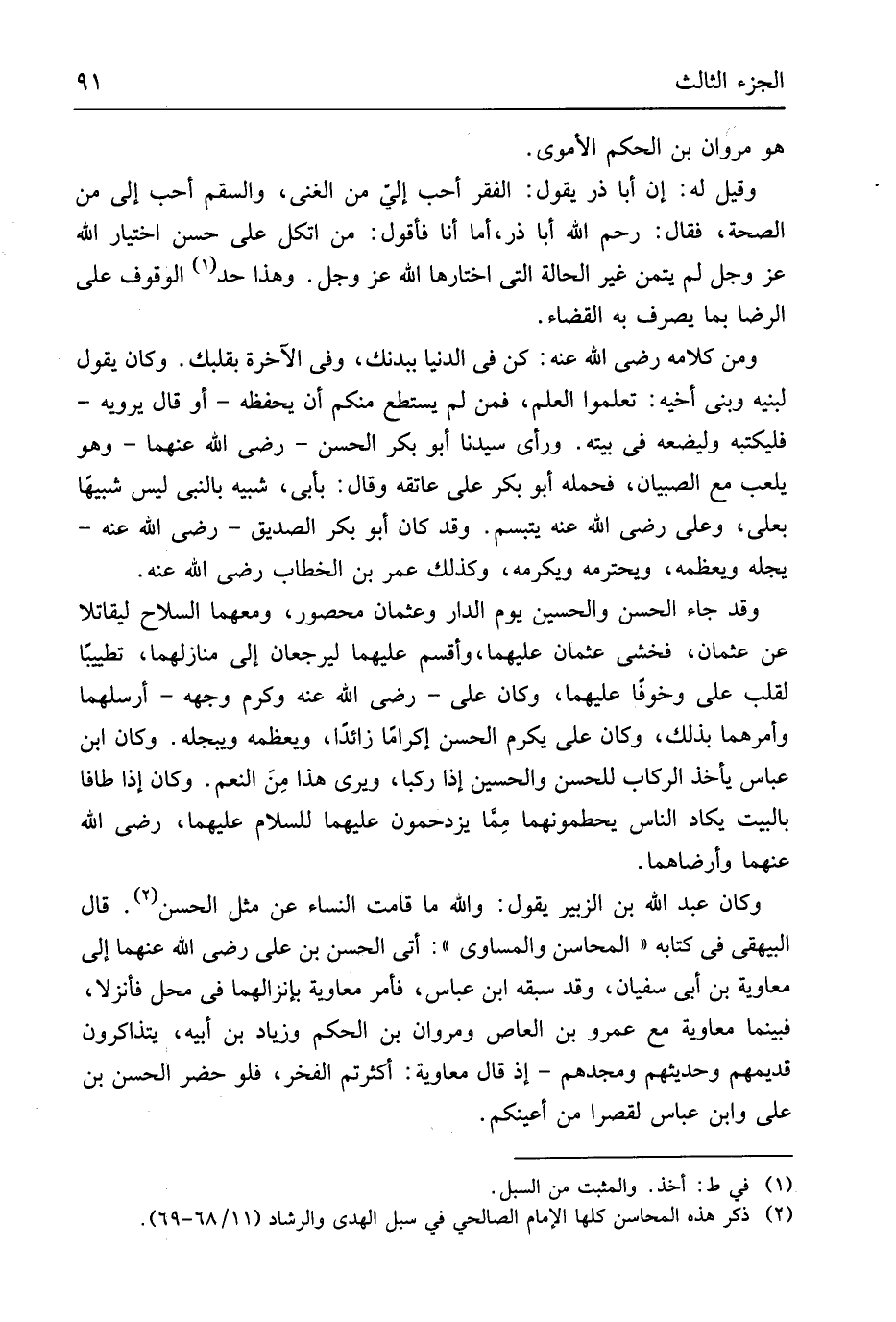 هُوَ مَرْوَان بن الحكم الْأمَوِي وَقيل لَهُ إِن أَبَا ذَر يَقُول الْفقر أحب إليّ من الْغنى والسقم أحب إِلَيّ من الصِّحَّة فَقَالَ رحم الله أَبَا ذَر أما أَنا فَأَقُول من اتكل على حسن اخْتِيَار الله عز وَجل لم يتمن غير الْحَالة الَّتِي اخْتَارَهَا لله عز وَجل وَهَذَا حد الْوُقُوف على الرِّضَا بِمَا يصرف بِهِ الْقَضَاء وَمن كَلَامه رَضِي الله عَنهُ كم فِي الدُّنْيَا بيدنك وَفِي الْآخِرَة بقلبك وَكَانَ يَقُول لِبَنِيهِ وَبني أَخِيه تعلمُوا الْعلم فَمن لم يسْتَطع مِنْكُم أَن يحفظه أَو قَالَ يرويهِ فليكتبه وليضعه فِي بَيته وَرَأى سيدنَا أَبُو بكر الْحسن رَضِي الله عَنْهُمَا وَهُوَ يلْعَب مَعَ الصّبيان فَحَمله أَبُو بكر على عَاتِقه وَقَالَ بِأبي شَبيه بِالنَّبِيِّ لَيْسَ شَبِيها بعلي وَعلي رَضِي الله عَنهُ يبتسم وَقد كَانَ أَبُو بكر الصّديق رَضِي الله عَنهُ يجله ويعظمه ويحترمه ويكرمه وَكَذَلِكَ عمر بن الْخطاب رَضِي الله عَنهُ وَقد جَاءَ الْحسن وَالْحُسَيْن يَوْم الدَّار وَعُثْمَان مَحْصُور ومعهما السِّلَاح ليقاتلا عَن عُثْمَان فخشي عُثْمَان عَلَيْهِمَا وَأقسم عَلَيْهِمَا ليرجعان إِلَى منازلهما تطييباً لقلب عَليّ وخوفاً عَلَيْهِمَا وَكَانَ عَليّ رَضِي الله عَنهُ وكرم وَجهه أرسلهما وَأَمرهمَا بذلك وَكَانَ عَليّ يكرم الْحسن إِكْرَاما زَائِدا ويعظمه ويبجله وَكَانَ ابْن عَبَّاس يَأْخُذ الركاب لِلْحسنِ وَالْحُسَيْن إِذا ركبا وَيرى هَذَا مِنَ النعم وَكَانَ إِذا طافا بِالْبَيْتِ يكَاد النَّاس يحطمونهما مِما يزدحمون عَلَيْهِمَا للسلام عَلَيْهِمَا رَضِي الله عَنْهُمَا وأرضاهما وَكَانَ عبد الله بن الزبير يَقُول وَالله مَا قَامَت النِّسَاء عَن مثل الْحسن قَالَ البهيقي فِي كِتَابه المحاسن والمساوى أَتَى الْحسن بن عَليّ رَضِي الله عَنْهُمَا إِلَى مُعَاوِيَة بن أبي سُفْيَان وَقد سبقه ابْن عَبَّاس فَأمر مُعَاوِيَة بإنزالهما فِي مَحل فأنزلا فَبَيْنَمَا مُعَاوِيَة مَعَ عَمْرو بن الْعَاصِ ومروان بن الحكم وَزِيَاد بن أَبِيه يتذاكرون قديمهم وحديثهم ومجدهم إِذْ قَالَ مُعَاوِيَة أَكثرْتُم الْفَخر فَلَو حر الْحسن بن عَليّ وَابْن عَبَّاس لقصرا من أعينكُم