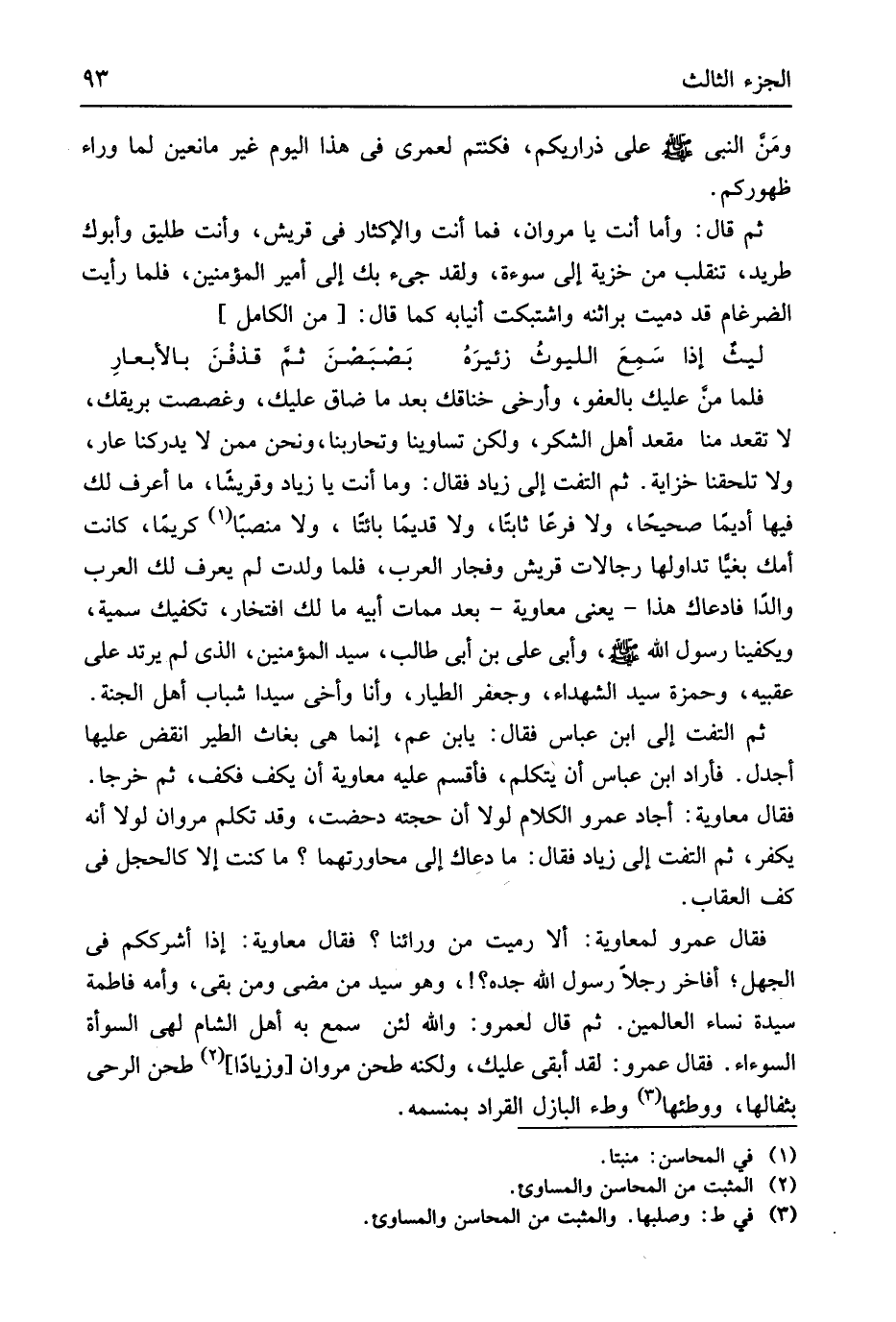وَأبي عَليّ بن أبي طَالب سيد الْمُؤمنِينَ الَّذِي لم يرْتَد على عَقِبَيْهِ وَحَمْزَة سيد الشُّهَدَاء وجعفر الطيار وَأَنا وَأخي سيدا شباب أهل الْجنَّة ثمَّ الْتفت إِلَى ابْن عَبَّاس فَقَالَ يَا بن عَم إِنَّمَا هِيَ بغاث الطير انقض عَلَيْهَا أجدل فَأَرَادَ ابْن عَبَّاس أَن يتَكَلَّم فأقسم عَلَيْهِ مُعَاوِيَة أَن يكف فَكف ثمَّ خرجا فَقَالَ مُعَاوِيَة أَجَاد عَمْرو الْكَلَام لَوْلَا أَن حجَّته دحضت وَقد تكلم مَرْوَان لَوْلَا أَنه يكفر ثمَّ الْتفت إِلَى زِيَاد فَقَالَ مَا دعَاك إِلَى محاورتهما مَا كنت إِلَّا كالحجل فِي كف الْعقَاب فَقَالَ عَمْرو لمعاوية أَلا رميت من وَرَائِنَا فَقَالَ مُعَاوِيَة إِذا أشرككم فِي الْجَهْل أفاخر رجلا رَسُول الله جده وَهُوَ سيد من مضى وَمن بَقِي وَأمه فَاطِمَة سيدة نسَاء الْعَالمين ثمَّ قَالَ لعَمْرو وَالله لَئِن سمع بِهِ أهل الشَّام لهى السوأة السوءاء فَقَالَ عَمْرو لقد أبقى عَلَيْك وَلكنه طحن مَرْوَان وزياداً طحن الرَّحَى يثفالها وَوَطئهَا وَطْء البازل القراد بمنسمه