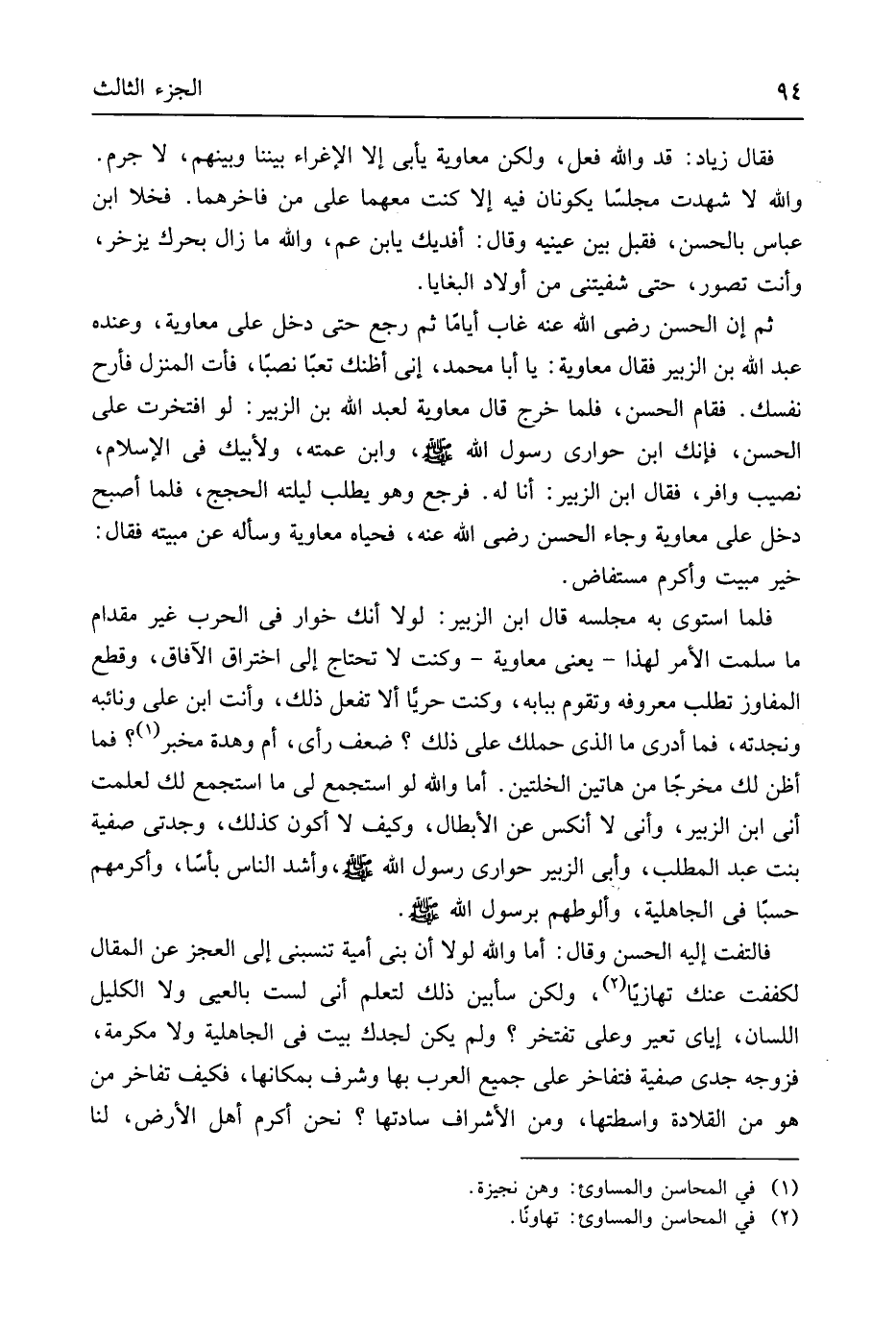 فَالْتَفت إِلَيْهِ الْحسن وَقَالَ أما وَالله لَوْلَا أَن بني أُميَّة تنسبني إِلَى الْعَجز عَن الْمقَال لكففت عَنْك تهازيَاً وَلَكِن سأبين ذَلِك لتعلم أَنِّي لست بالعي وَلَا الكليل اللِّسَان إيَّايَ تعير وَعلي تفتخر وَلم يكن لجدك بَيت فِي الْجَاهِلِيَّة وَلَا مكرمَة فَزَوجهُ جدي صَفِيَّة فتفاخر على جَمِيع الْعَرَب بهَا وَشرف بمكانتها فَكيف تفاخر من هُوَ من القلادة واسطتها وَمن الْأَشْرَاف سادتها نَحن أكْرم أهل الأَرْض لنا