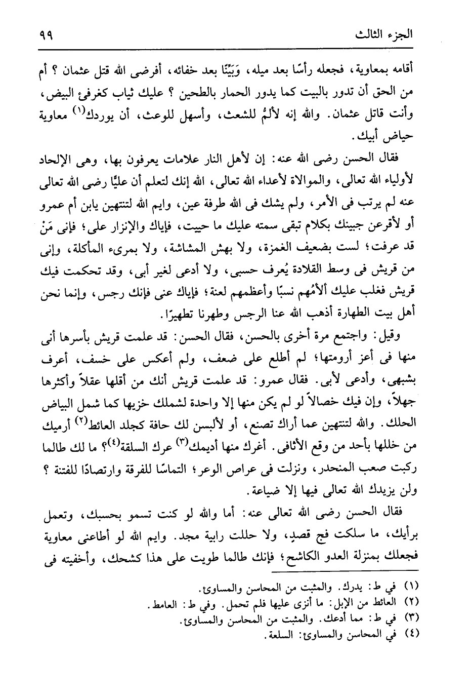 أَقَامَهُ بِمُعَاوِيَة فَجعله رأسَاً بعد ميله وَبَينا بعد خفائه أفرضي الله قتل عُثْمَان أم من الْحق أَن تَدور بِالْبَيْتِ كَمَا يَدُور الْحمار بالطحين عَلَيْك ثِيَاب كغرفئ الْبيض وَأَنت قَاتل عُثْمَان وَالله إِن لألم للشعت وأسهل للوعث أَن يوردك مُعَاوِيَة حِيَاض أَبِيك فَقَالَ الْحسن رَضِي الله عَنهُ إِن لأهل النَّار عَلَامَات يعْرفُونَ بهَا وَهِي الْإِلْحَاد لأولياء الله تَعَالَى والمولاة لأعداء الله تَعَالَى الله إِنَّك لتعلم أَن عليا رَضِي الله تَعَالَى عَنهُ لم يرتب فِي الْأَمر وَلم يشك فِي الله طرفَة عين وَايْم الله لتنتهين يَا بن أم عَمْرو أَو لأقرعن جبينك بِكَلَام تبقى سمته عَلَيْك مَا حييت فإياك والإنزال عَليّ فَإِنِّي مَنْ قد عرفت لست بضعيف الغمرة وَلَا بهش المشاشة وَلَا بمرئ المأكلة وَإِنِّي من قُرَيْش فِي وسط القلادة يُعرف حسبي وَلَا أَدعِي لغير أبي وَقد تحكمت فِيك قُرَيْش فغلب عَلَيْك ألأمهم نسبا وعظمهم لعنة فإياك عني فَإنَّك رِجْس وَإِنَّمَا نَحن هَل بَيت الطَّهَارَة أذهب الله عَنَّا الرجس وَطَهِّرْنَا تَطْهِيرا وَقيل وَاجْتمعَ مرّة أُخْرَى بالْحسنِ فَقَالَ الْحسن قد علمت قُرَيْش بأسرها أَنِّي مِنْهَا فِي عز أرومتها لم أطلع على ضعف وَلم أعكس على خسف أعرف بشبهي وأدع لأبي فَقَالَ عَمْرو قد علمت قُرَيْش أَنَّك من أقلهَا عقلاَ وأكثرها جهلاَ وَإِن فِيك خِصَالًا لَو لم يكن مِنْهَا إِلَّا وَاحِدَة لشملك خزيها كَمَا شَمل الْبيَاض الحلك وَالله لتنبهين عَمَّا أَرَاك تصنع أَو لألبسن لَك حافة كَجلْد العائط أرميك من خللها بِأخذ من وَقع الأثافي أغرك مِنْهَا أديمك عَرك السلقة مَا لَك طالما ركبت صَعب المنحدر وَنزلت غي عراص الوعر التماساً للفرقة وارتصاداً للفتنة وَلنْ يزيدك الله تَعَالَى فِيهَا إِلَّا ضياعة فَقَالَ الْحسن رَضِي الله تَعَالَى عَنهُ أما وَالله لَو كنت تسمو بحسبك وتعمل بِرَأْيِك مَا سلكت فج قصد وَلَا حللت رابية مجد وليم الله لَو أطعني مُعَاوِيَة فجعلك بِمَنْزِلَة الْعَدو الْكَاشِح فَإنَّك طالما طويت على هَذَا كشحك وأخفيته فِي