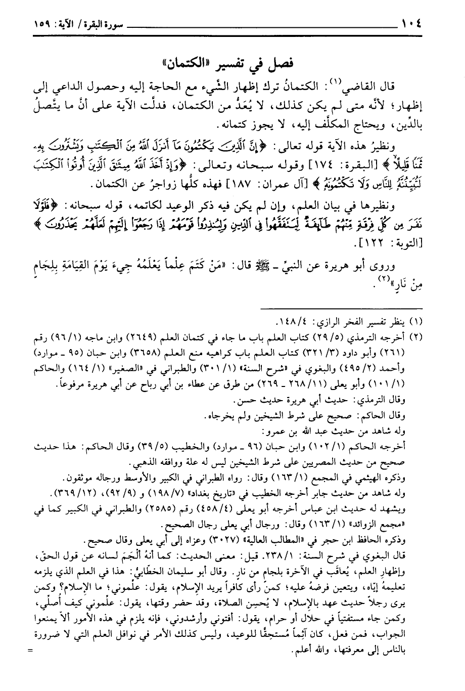 قال القاضي: الكتمانُ ترك إظهار الشَّيء مع الحاجة إليه وحصول الداعي إلى أظهار؛ للأأنَّه متى لم يكن كذلك، لا يُعَدُّ من الكتمان، فدلَّت الآية على أنَّ ما يتَّصلُ، بالدِّين، ويحتاج المكلَّف إليه، لا يجوز كتمانه.