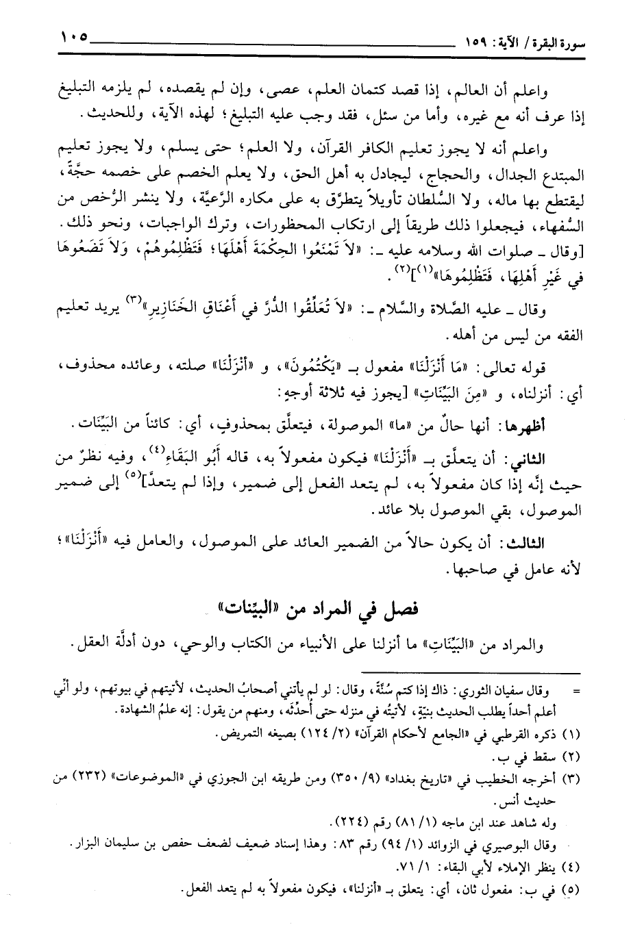 قوله تعالى: «مَا أَنْزَلْنَا» مفعول ب «يَكْتُمُونَ» ، و «أَنْزَلْنَا» صلته، وعائده محذوف، أي: أنزلناه، و «مِنَ البَيِّنَاتِ» [يجوز فيه ثلاثة أوجهٍ: