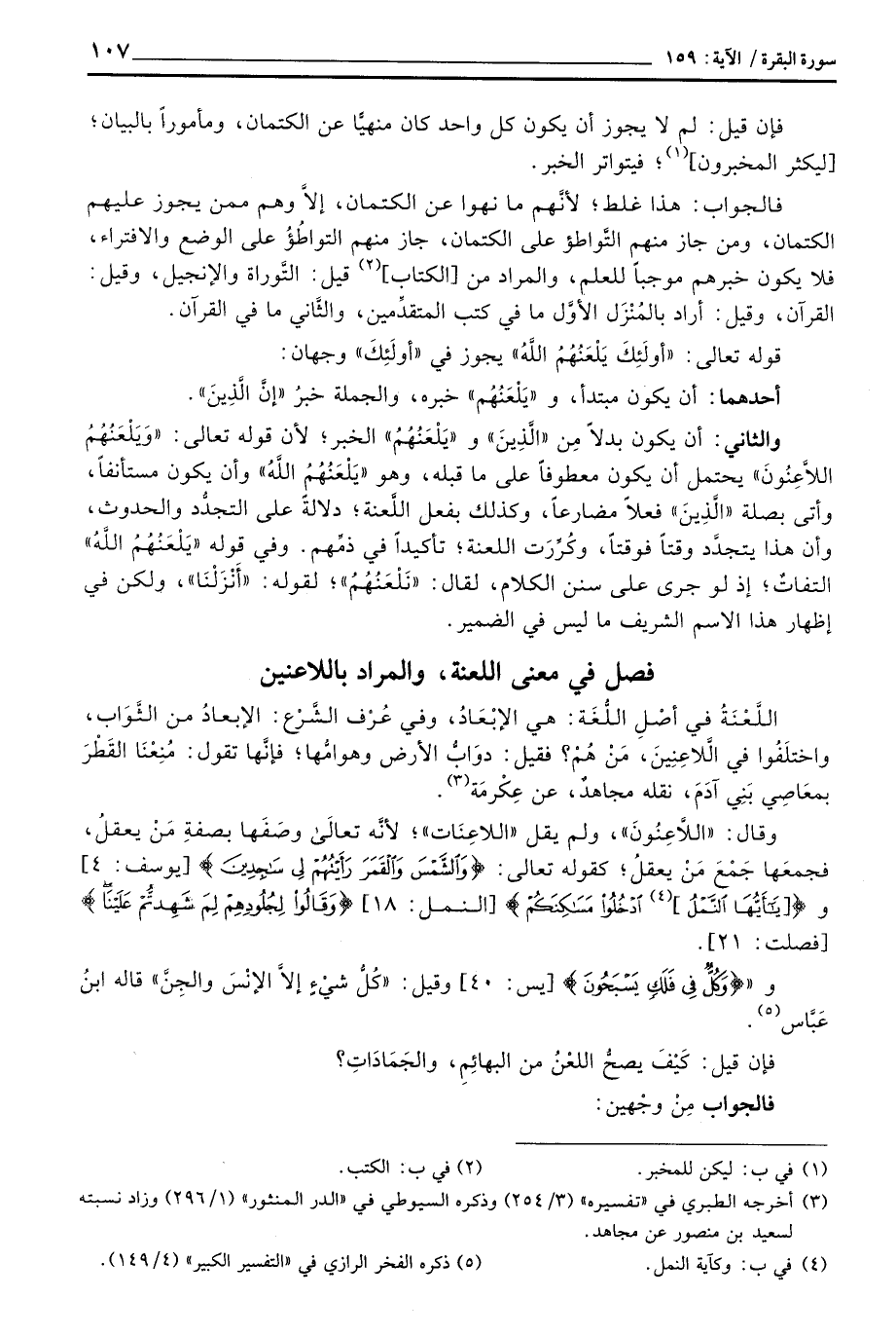 وقال: «اللاَّعِنُونَ» ، ولم يقل «اللاعِنَات» ؛ لأنَّه تعالَى وصَفَها بصفةِ مَنْ يعقلُ، فجمعَها جَمْعَ مَنْ يعقلُ؛ كقوله تعالى: {والشمس والقمر رَأَيْتُهُمْ لِي سَاجِدِينَ} [يوسف: 4] و {ياأيها النمل ادخلوا مَسَاكِنَكُمْ} [النمل: 18] {وَقَالُواْ لِجُلُودِهِمْ لِمَ شَهِدتُّمْ عَلَيْنَا} [فصلت: 21] .