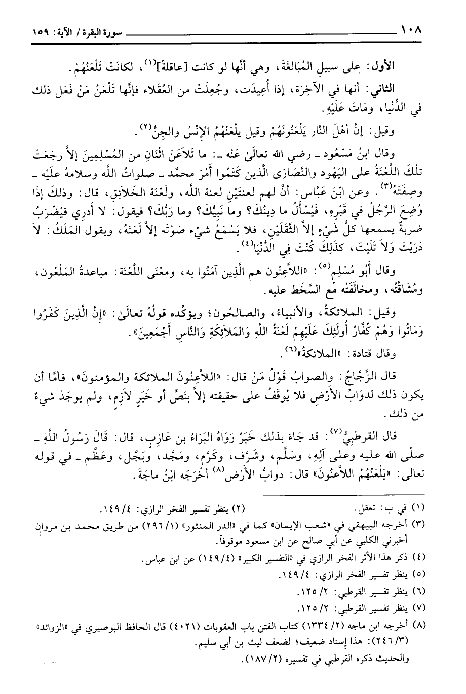 وقال ابنُ مَسْعُود - رضي الله تعالَى عَنْه -: ما تَلاَعنَ اثْنَانِ من المُسْلِمِينَ إلاَّ رجَعَتْ تلْكَ اللَّعْنَةُ على اليَهُود والنَّصَارَى الَّذين كَتَمُوا أَمْرَ محمَّد - صلواتُ الله وسلامهُ علَيْه - وصِفَتَهُ. وعن ابْنَ عَبَّاس: أنَّ لهم لعنتَيْنِ لعنة الله، ولَعْنَة الخَلاَئِقِ، قال: وذلك إذَا وُضِعَ الرَّجُلُ في قَبْرِهِ، فَيُسْأَلُ ما دِينُكَ؟ وما نَبِيُّكَ؟ وما رَبُّكَ؟ فيقول: لا أَدرِي فيُضْرَبُ ضربةً يسمعها كلُّ شَيْءٍ إلاَّ الثَّقَلَيْنِ، فلا يَسْمَعُ شيْء صَوْتَه إلاَّ لَعَنَهُ، ويقول المَلَكُ: لاَ دَرَيْتَ وَلاَ تَلَيْتَ، كذَلِكَ كُنْتَ فِي الدُّنْيَا.