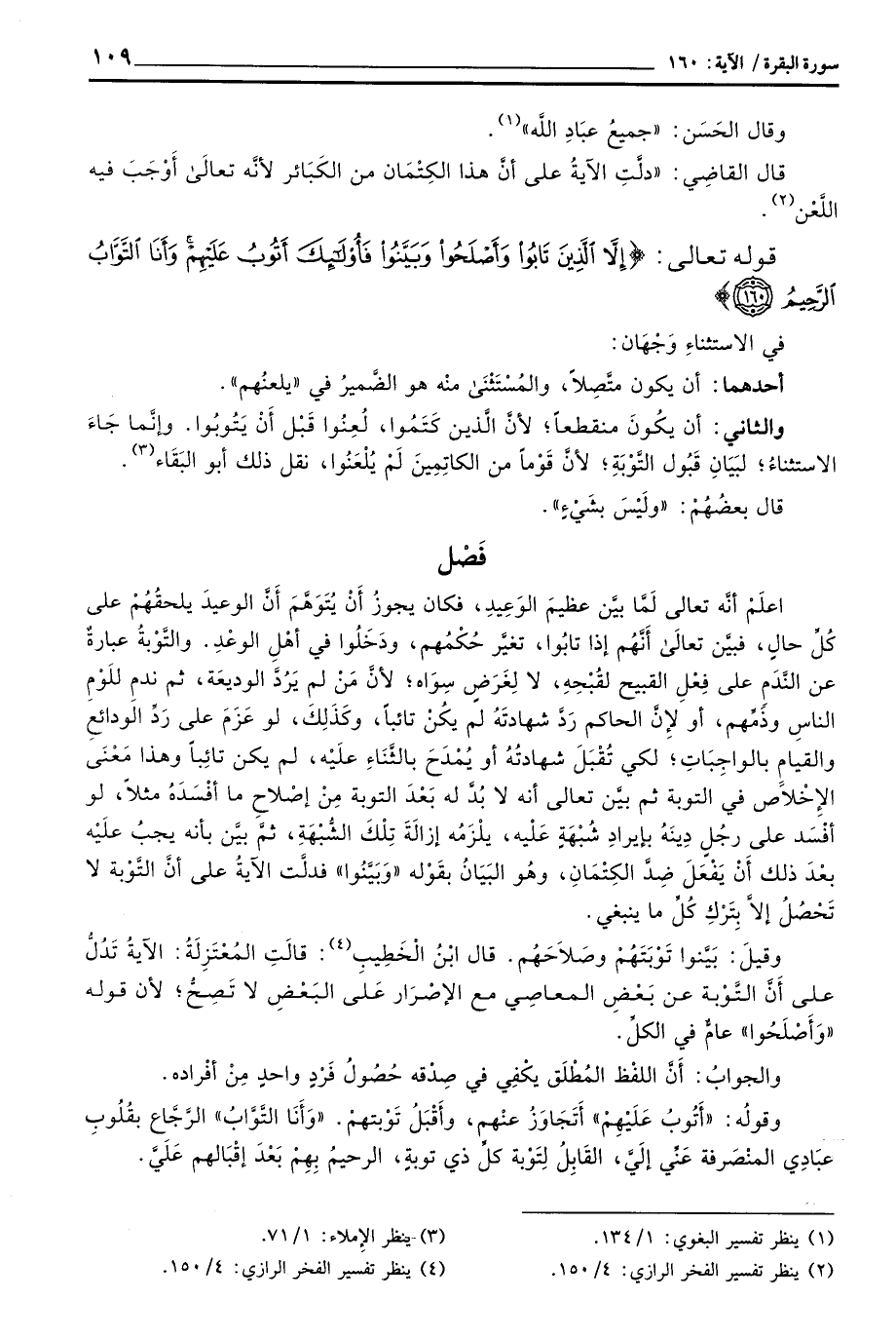 اعلَمْ أنَّه تعالى لَمَّا بيَّن عظيمَ الوَعِيدِ، فكان يجوزُ أَنْ يُتَوَهَّمَ أَنَّ الوعيدَ يلحقُهُمْ على كُلِّ حالٍ، فبيَّن تعالَى أَنَّهُمْ إذا تابُوا، تغيَّر حُكْمُهم، ودَخَلُوا في أهْلِ الوعْدِ. والتَّوْبةُ عبارةٌ عن النَّدَم على فِعْلِ القبيح لقُبْحِهِ، لا لِغَرَضٍ سِوَاه؛ لأنَّ مَنْ لم يَرُدَّ الوديعَة، ثم ندمِ للَوْمِ الناس وذمِّهم، أو لإِنَّ الحاكم رَدَّ شهادتَهُ لم يكُنْ تائباً، وكَذَلِكَ، لو عَزَمَ على رَدِّ الودائعِ والقيام بالواجِبَاتِ؛ لكي تُقْبَلَ شهادتُهُ أو يُمْدَحَ بالثَّنَاءِ علَيْه، لم يكن تائِباً وهذا مَعْنَى الإِخْلاَّص في التوبة ثم بيَّن تعالى أنه لا بُدَّ له بَعْدَ التوبة مِنْ إصْلاح ما أفْسَدَهُ مثلاً، لو أفْسَد على رجُلِ دِينَهُ بإيرادِ شُبْهَةٍ عَلْيه، يلْزَمُه إزالَة تِلْكَ الشُّبْهَةِ، ثمَّ بيَّن بأنه يجبُ علَيْه بعْدَ ذلك أَنْ يَفْعَلَ ضِدَّ الكِتْمَانِ، وهُو البَيَانُ بقَوْله «وَبَيَّنُوا» فدلَّت الآيةُ على أنَّ التَّوْبة لا تَحْصُلُ إلاَّ بِتَرْكِ كُلِّ ما ينبغي.