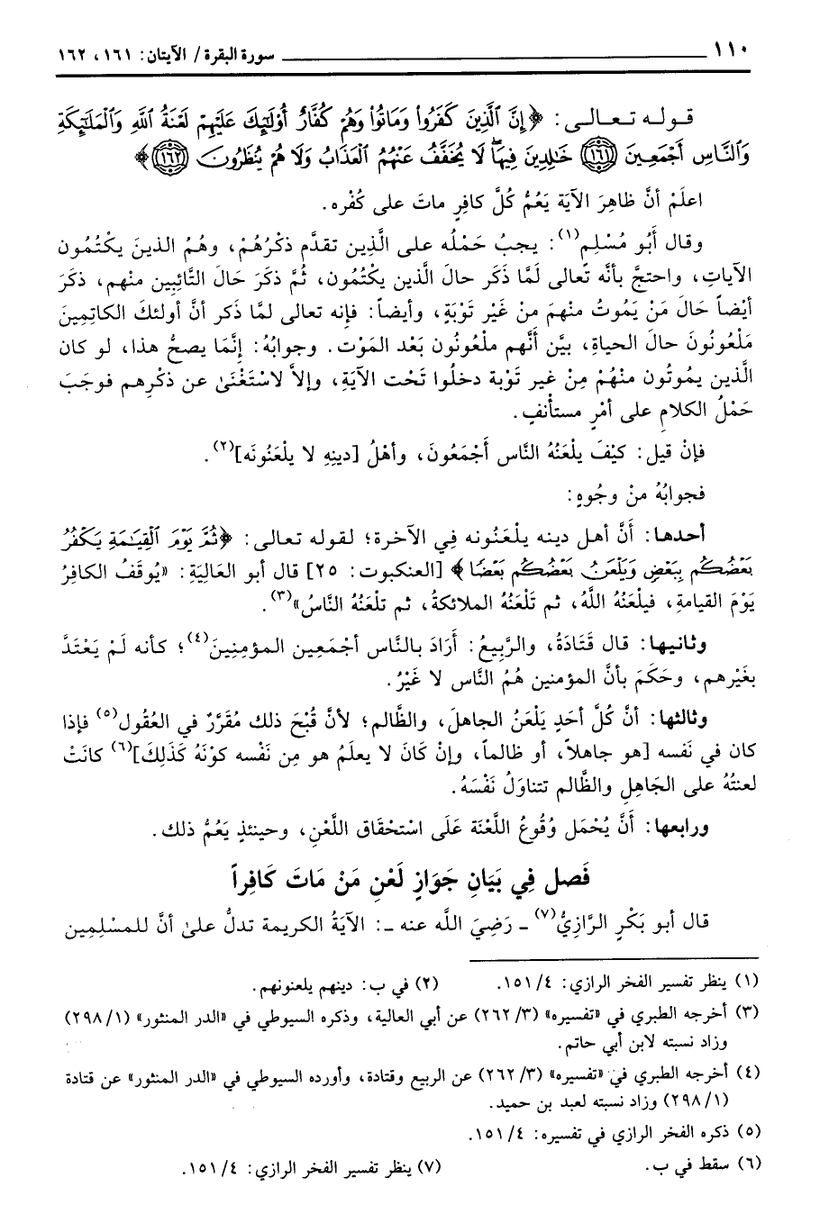 وقال أَبُو مُسْلِم: يجبُ حَمْلُه على الَّذِينَ تقدَّم ذكْرُهُمء، وهُمُ الذينَ يكْتُمُون الآياتِ، واحتجَّ بأنَّهُ تعالى لَمَّا ذَكَر حالَ الَّذشين يكْتُمُون، ثُمَّ ذكَرَ حالَ التَّائِبِين منْهم، ذكَرَ أيْضاً حَالَ مَن يَمُوتُ منْهم منْ غَيْر تَوْبَةٍ، وأيضاً: فإِنه تعالى لمَّا ذَكر أنَّ أولئكَ الكاتِمِينَ مَلْعُونُونَ حالَ الحياةِ، بيَّن أَنَّهم ملْعُونُون بَعْد المَوْت. وجوابُهُ: إِنَّمَا يصحُّ هذا، لو كان الَّذين يمُوتُون منْهُمْ مِنْ غير تَوْبة دخلُوا تَحْت الآيَةِ، وإلاَّ لاسْتَغْنَى عن ذكْرِهم فوجَبَ حَمْلُ الكلامِ على أمْرٍ مستأْنفٍ.
