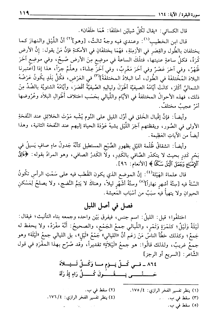 قال ابن الخطيبِ: وعندي فيه وجهٌ ثالثٌ، [وهو] أنَّ اللَّيْل والنهارَ كما يختلفان بالطُّول والقِصَرِ في الأزمِنَةِ، فهُمَا يختلفَانِ في الأمكنةِ فإنَّ مَنْ يقول: إِنَّ الأرض كُرَةٌ، فكلُّ ساعةٍ عنيتها، فتلْكَ الساعةُ في موضِع مِنَ الأرض صُبحٌ، وفي موضِعٍ آخَرَ ظُهْرٌ، وفي آخرَ عَصْرٌ وفي آخَرَ مَغْرِبٌ، وفي آخَرَ عِشَاءٌ، وهلُمَّ جرّاً، هذا إذا [اعتبرنا البلادَ المُخْتلفَةَ في الطُول، أما البلادُ المختلفَةُ] في العَرْضِ، فكُلُّ بَلَدٍ يكُونُ عَرْضُهُ الشماليُّ أكْثَرَ، كانَتْ أَيَّامُهُ الصيفيَّة أطْوَلَ وليالِيهِ الصَّيفيَّةُ أقْصَرَ، وأَيَّامُهُ الشتويَّة بالضِّدِّ مِنْ ذلك، فهذه الأحوالُ المختلفةُ في الأيَّام واللَّيالي بحَسَب اختلاف أَطْوالِ البلاَد وعُرُوضها أمْرٌ عجيبٌ مختلفٌ.