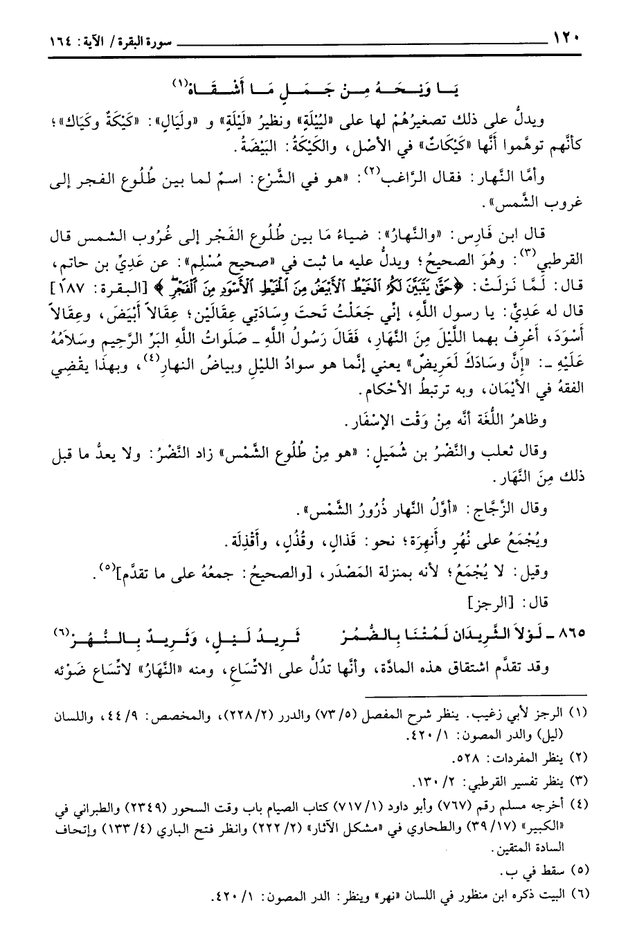 قال ابن فَارِس: «والنَّهارُ» : ضياءُ مَا بين طُلُوع الفَجْر إلى غُرُوب الشمس قال القرطبي: وهُوَ الصحيحُ؛ ويدلُّ عليه ما ثبت في «صحيح مُسْلِم» : عن عَدِيِّ بن حاتم، قال: لَمَّا نَزلَتْ: {حتى يَتَبَيَّنَ لَكُمُ الخيط الأبيض مِنَ الخيط الأسود مِنَ الفجر} [البقرة: 187] قال له عَدِيٌّ: يا رسول اللهِ، إنِّي جَعَلتُ تَحتَ وِسَادَتِي عِقَالَيْن؛ عِقَالاً أَبْيَضَ، وعِقَالاً أَسْوَدَ، أَعْرِفُ بهما اللَّيْلَ مِنَ النَّهَارِ، فَقَالَ رَسُولُ اللهِ - صَلَواتُ اللهِ البَرِّ الرَّحِيم وسَلاَمُهُ عَلَيْهِ -: «إِنَّ وسَادَكَ لَعَرِيضٌ» يعني إنَّما هو سوادُ الليْلِ وبياضُ النهارِ، وبهذَا يقْضِي الفقهُ في الأيْمَان، وبه ترتبطُ الأحْكام.