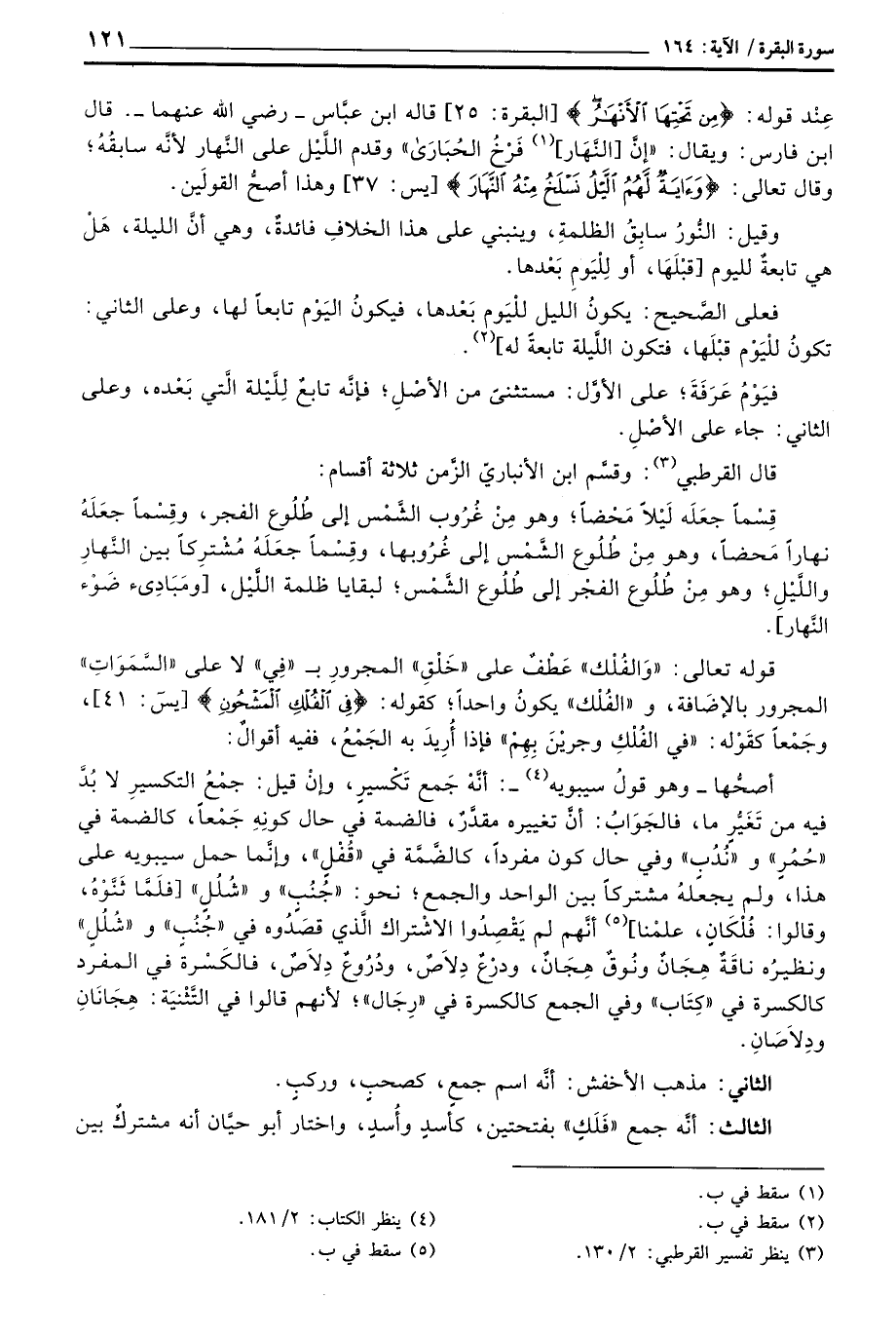 قوله تعالى: «وَالفُلْك» عَطْفٌ على «خَلْقٍ» المجرورة ب «فِي» لا على «السَّمَواتِ» المجرورة بالإضافة، و «الفُلْك» يكونُ واحداً؛ كقوله: {فِي الفلك المشحون} [يس: 41] ، وجَمْعاً كقَوْله: «في الفُلْكِ {فِي الفلك وَجَرَيْنَ بِهِم} [يونس: 22] فإذا أُرِيدَ به الجَمْعُ، ففيه أقوالٌ: