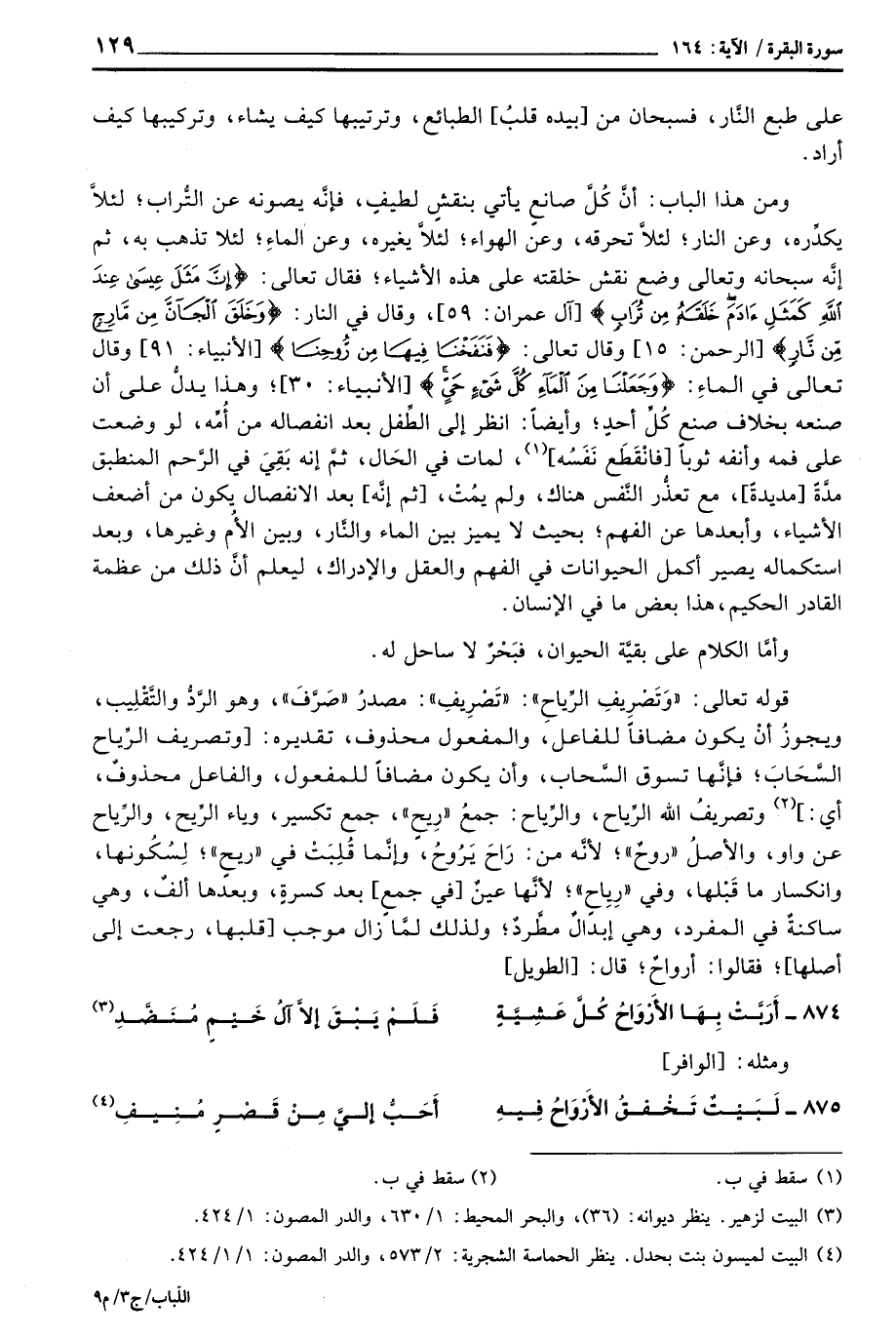 قوله تعالى: «وَتَصْرِيفِ الرَّيِاحِ» : «تَصْرِيفِ» : مصدرُ «صَرَّفَ» ، وهو الرَّدُّ والتَّقْلِيب، ويجوزُ أنْ يكون مضافاً للفاعل، والمفعول محذوف، تقديره: [وتصريف الرِّياح السَّحَابَح فإنَّها تسوق السَّحاب، وأن يكون مضافاً للمفعول، والفاعل محذوفٌ، أي:] وتصريفُ الله الرِّياح، والرِّياح: جمعُ «رِيح» ، جمع تكسير، وياء الرِّيح، والرِّياح عن واو، والأصلُ «روحٌ» ؛ لأنَّه من: رَاحَ يَرُوحُ، وإنَّما قُلِبَتْ في «ريح» ؛ لِسُكُونها، وانكسار ما قَبْلها، وفي «رِيِاح» ؛ لأنَّها عينٌ [في جمع] بعد كسرةٍ، وبعدها ألفٌ، وهي ساكنةٌ في المفرد، وهي إبدالٌ مطَّردٌ؛ ولذلك لمَّا زال موجب [قلبها، رجعت إلى أصلها] ؛ فقالوا: أرواحٌ؛ قال: [الطويل]