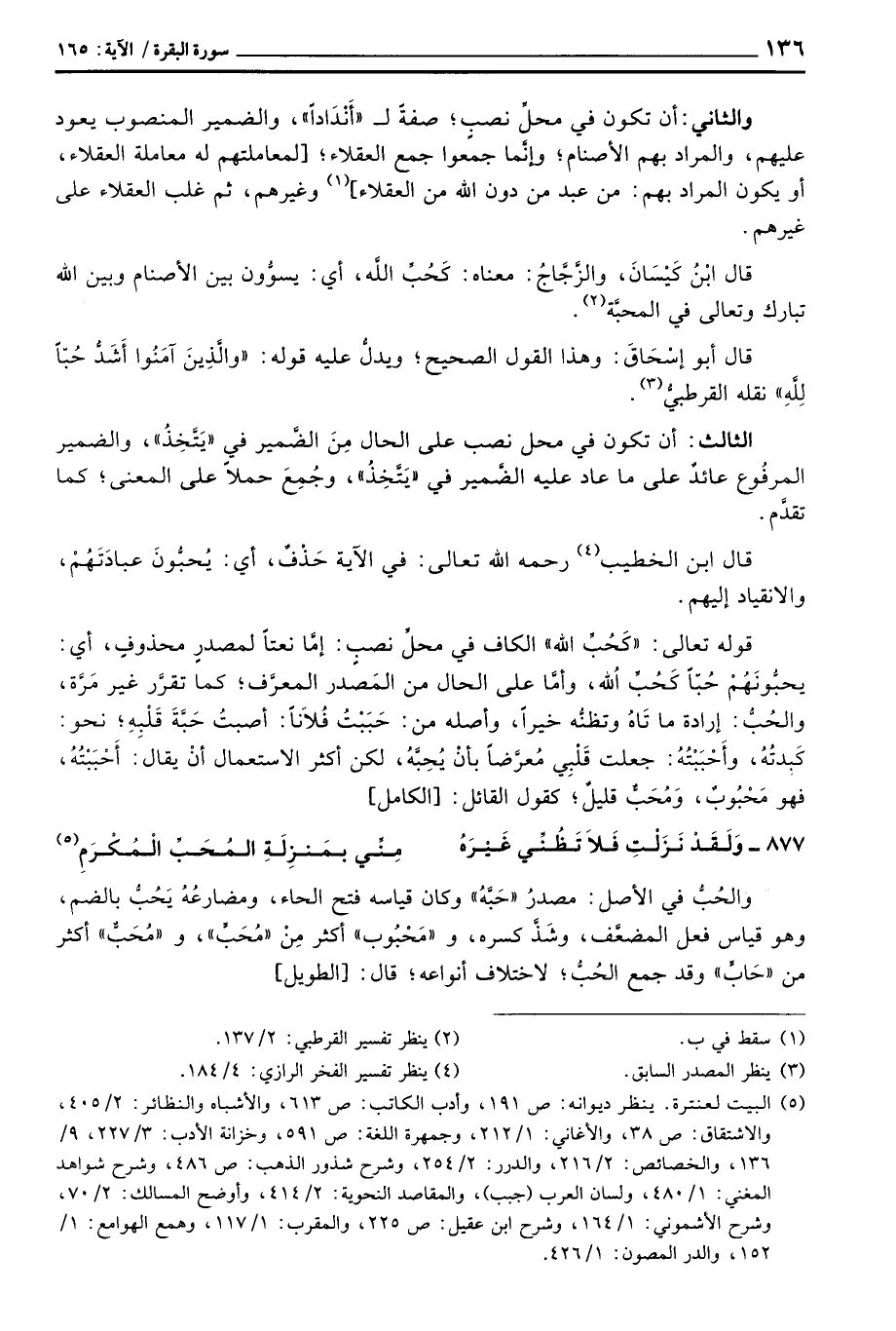 قوله تعالى: «كَحُبِّ الله» الكاف في محلِّ نصبٍ: إمَّا نعتاً لمصدرٍ محذوفٍ، أي: يحبُّونَهُمْ حُبّاً كَحُبِّ الله، وأمَّا عل الحال من المَصدر المعرَّف؛ كما تقرَّر غير مَرَّة، والحُبُّ: إرادة ما تَاهُ وتظنُّه خيراً، وأصله من: حَبَبْتُ فُلانَاً: أصبحتُ حَبَّةَ قَلْبِهِ؛ نحو: كَبِدتُهُ، وأَحْبَبْتُهُ: جعلت قَلْبِي مُعرَّضاً بأنْ يُحِبَّهُ، لكن أكثر الاستعمال أنْ يقال: أَحْبَبْتُهُ، فهو مَحْبُوبٌ، وَمُحَبٌّ قليلٌ؛ كقول القائل: [الكامل]