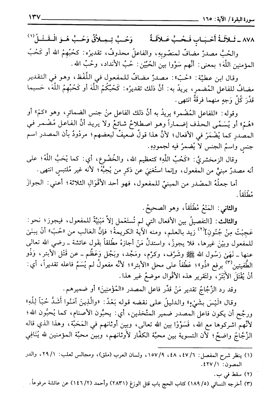 والحُبُّ مصدرٌ لمنصُوبِهِ، والفاعلُ محذوفٌ، تقديرُه، كحُبِّهِمْ الله أو كَحُبِّ المؤمنين اللهِ؛ بمعنى: أنَّهم سَوَّوا بين الحُبَّيْن: حبِّ الأنداد، وحُبِّ الله.