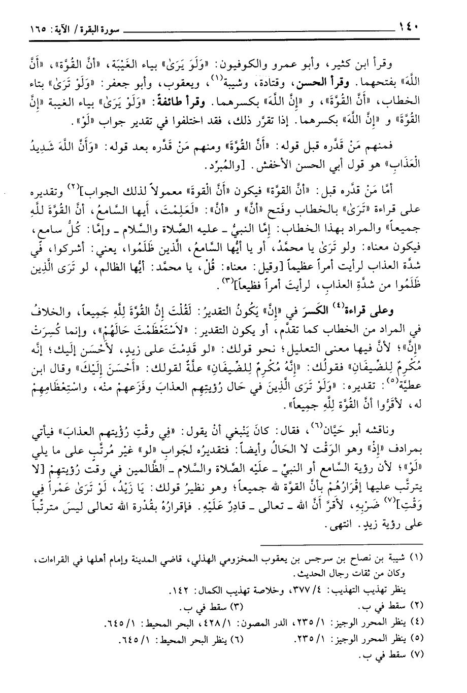 وقرأ ابن كثير، وأبو عمرو والكوفيون: «وَلَوَ يَرَى» بياء الغَيْبَة، «أنَّ القُوَّة» ، «أَنَّ اللهَ» بفتحهما. وقرأ الحسن، وقتادة وشيبة، ويعقوب، وأبو جعفر: «وَلَوْ تَرَى» بتاء الخطاب، «أَنَّ القُوَّةَ» ، و «إِنَّ اللهِ» بكسرهما. وقرا طائفةٌ: «وَلَوْ يَرَى» بياء الغيبة «إِنَّ القُوَّة» و «إِنَّ اللهِ» بكسرهما. إذا تقرَّر ذلك، فقد اختلفوا في تقدير جواب «لَوْ» .
