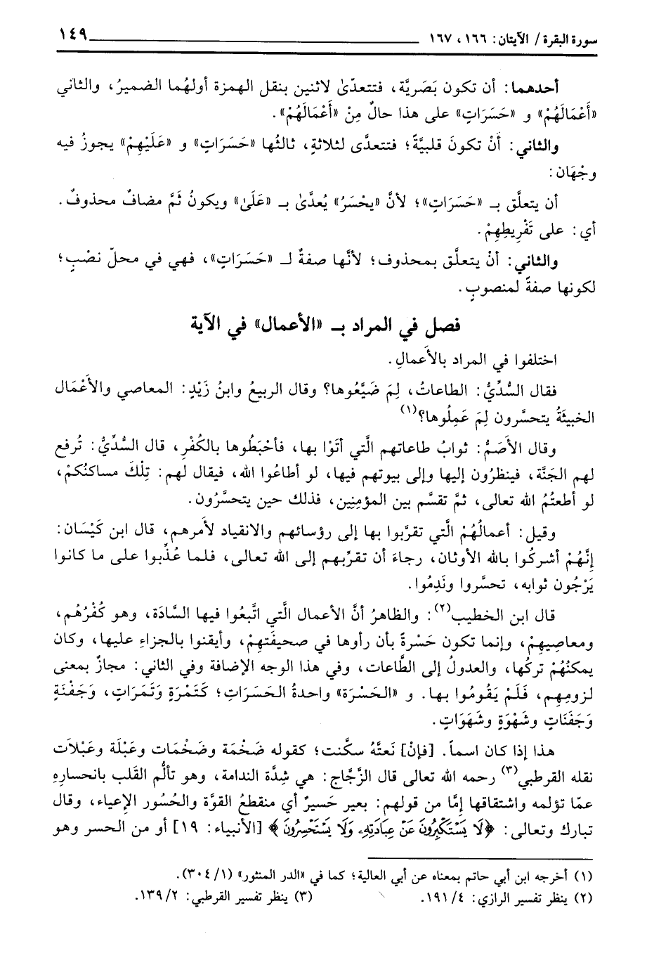 قال ابن الخطيب: والظاهرُ أنَّ الأعمال الَّتي اتَّبَعُوا فيها السَّادَة، وهو كُفْرُهُم. ومعاصِيهِمْ، وإنما تكون حَسْرةً بأن رأوها في صحيفَتهِمْ، وأيقنوا بالجزاءِ عليها، وكان يمكنُهُمْ تركُها، والعدولُ إلى الطَّاعات، وفي هذا الوجه الإضافة وفي الثاني: مجازٌ بمعنى لزومِهِم، فَلَمْ يَقُومُوا بها. و «الحَسْرَة» واحدةُ الحَسَرَاتِ؛ كَتَمْرَةٍ وَتَمَرَاتٍ، وَجَفْنَةٍ وَجَفَنَاتٍ وشَهَوَاتٍ.