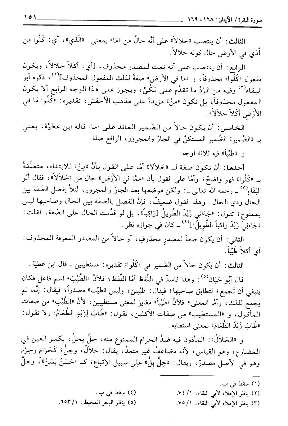 أحدها: أن تكون صفة ل» حَلاَل «أمَّا على القول بأنَّ» مِنْ «للابتداء، متعلِّقةٌ ب» كُلُوا «فهو واضحٌ؛ وأمَّا على القول بأن» مِمَّا في الأَرْضِ «حال من» حَلاَلاً «، فقال أبُوا البَقَاءِ - رَحِمَهُ اللهُ تعالى -: ولكن موضعها بعد الجارِّ والمجرور، لئلاَّ يفصل الصِّفة بين الحال وذي الحال. وهذا القول ضعيفٌ، فإنَّ الفصل بالصفة بين الحال وصاحبها ليس بممنوعٍ؛ تقول» جَاءَنِي زَيْدٌ الطَّويلُ [راكِباً «، بل لو قدَّمت الحال على الصِّفة، فقلت:» جاءَنِي زَيْدٌ راكباً الطَّوِيلٌ «]- كان في جوازه نظر.