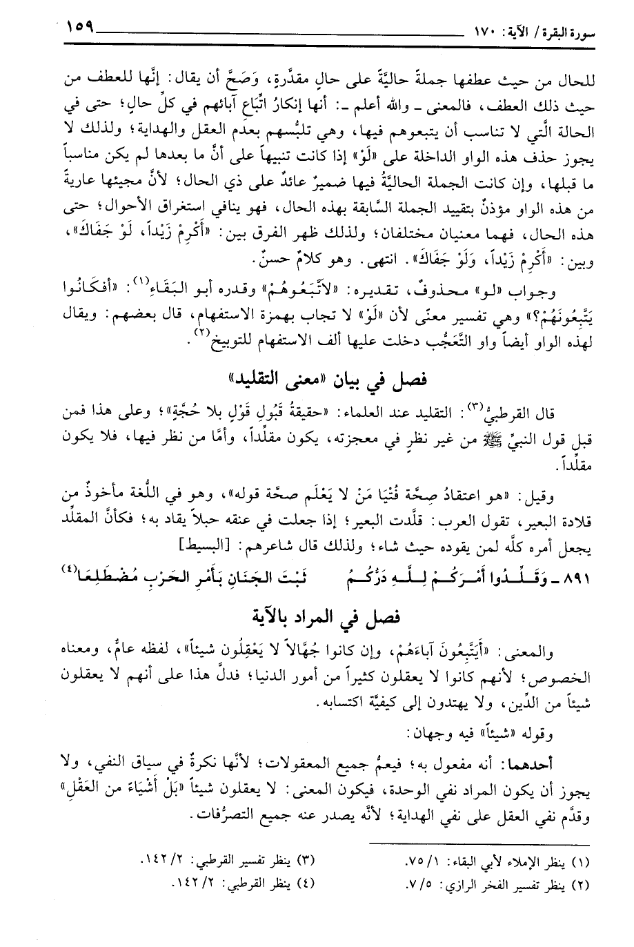 والمعنى: «أَيَتَّبِعُونَ آباءَهُمْ، وإن كانوا جُهَّالاً لا يَعْقِلُون شيئاً» ، لفظه عامٌّ، ومعناه الخصوص؛ لأنهم كانوا لا يعقلون كثيراً من أمور الدنيا؛ فدلَّ هذا على أنهم لا يعقلون شيئاً من الدِّين، ولا يهتدون إلى كيفيَّة اكتسابه.