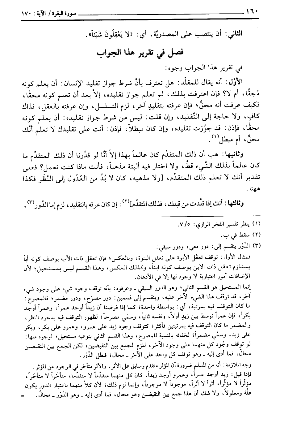 الأوَّل: أنه يقال للمقلِّد: هل تعترف بأنَّ شرط جواز تقليد الإنسان: أن يعلم كونه مُحِقَّا، أم لا؟ فإن اعترفت بذلك، لم تعلم جواز تقليده، إلاَّ بعد أن تعلم كونه محقّاً، فكيف عرفت أنه محقٌّ؛ فإن عرفته بتقليدٍ آخر، لزم التسلسل، وإن عرفته بالعقل، فذاك كافٍ، ولا حاجة إلى التَّقليد، وإن قلت: ليس من شرط جواز تقليده: أن يعلم كونه محقّاً، فإذن: قد جوَّزت تقليده، وإن كان مبطلاً، فإذن: انت على تقليدك لا تعلم أنَّك محقٌّ، أم مبطل.