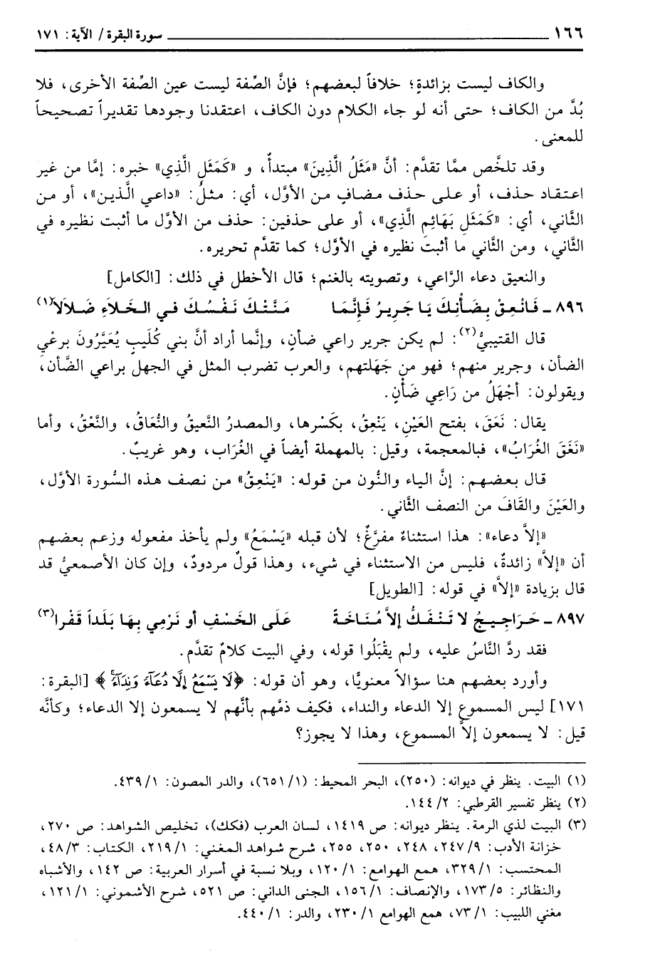 وقد تلخَّص ممَّا تقدَّم: أنَّ «مَثَلُ الَّذِينَ» مبتأٌ، و «كَمَثَلِ الَّذِي» خبره: إمَّا من غير اعتقاد حذف، أو على حذف مضافٍ من الأوَّل، أي: «مثلُ:» داعي الَّذين «، أو من الثَّاني، أي:» كَمَثَلِ بَهَائِم الَّذِي «، أو على حذفين: حذف من الأوَّل ما أثبت نظيره في الثَّاني، ومن الثَّاني ما أثبتَ نظيره في الأوَّل؛ كما تقدَّم تحريره.