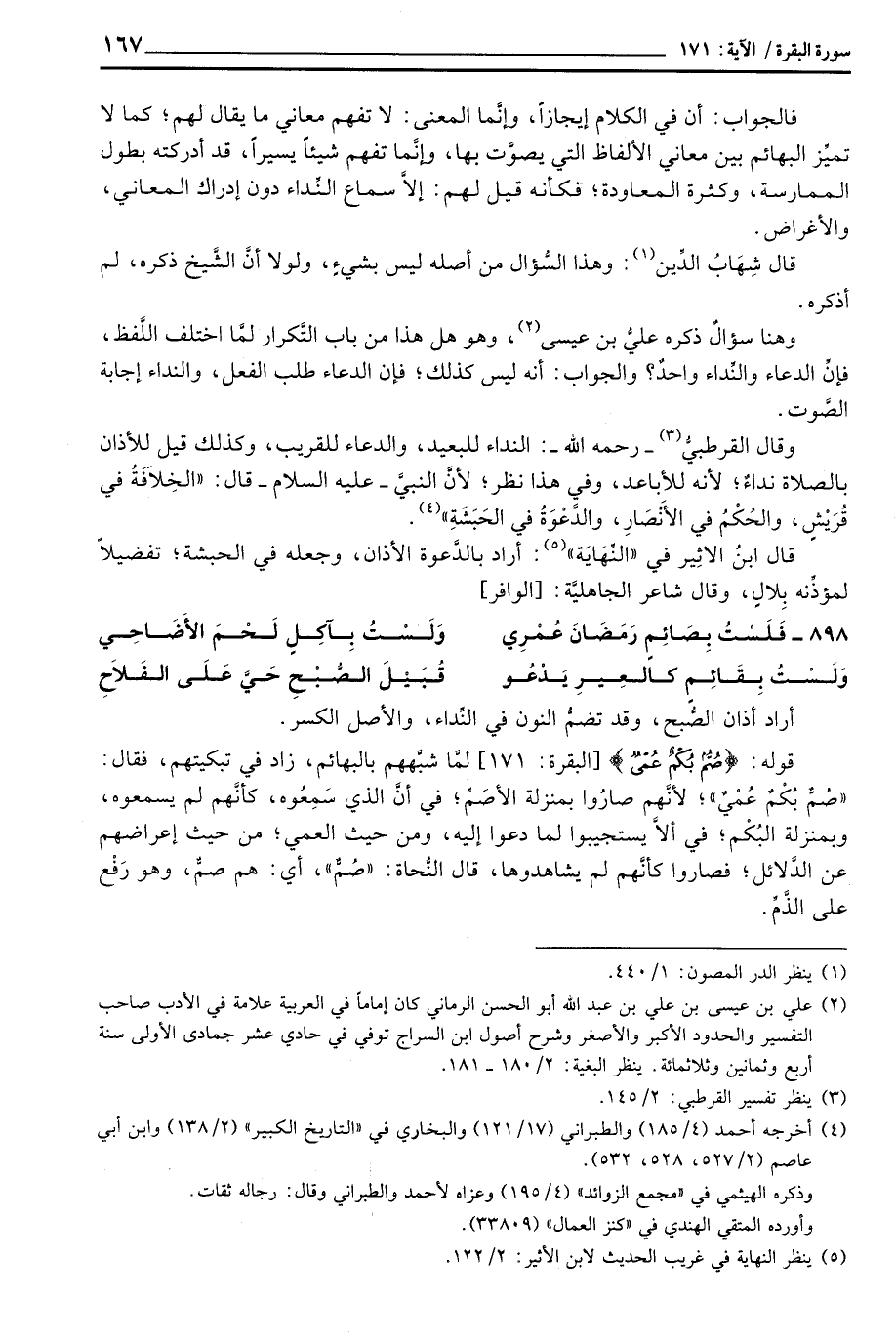 فالجواب: أن في الكلام إيجازاً، وإنَّما المعنى: لا تفهم معاني ما يقال لهم؛ كما لا تميِّز البهائم بين معاني الألفاظ التي يصوَّت بها، وإنَّما تفهم شيئاً يسيراً، قد أدركته بطول الممارسة، وكثرة المعاودة؛ فكأنه قيل لهم: إلاَّ سماع النِّداء دون إدراك المعاني، والأغراض.