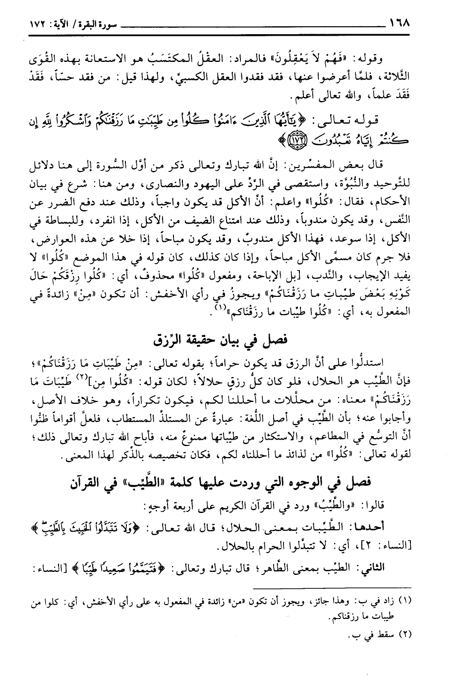 استدلُّوا على أنَّ الرزق قيد يكون حراماً؛ بقوله تعالى: «مِنْ طَيِّبَاتِ مَا رَزَقْنَاكُمْ» ؛ فإِنَّ الطَّيِّب هو الحلال، فلو كان كلُّ رزقٍ حلالاً؛ لكان قوله: «كُلُوا مِن] طَيِّبَاتَ مَا رَزَقْنَاكُمْ» معناه: من محلَّلات ما أحللنا لكم، فيكون تكراراً، وهو خلاف الأصل، وأجابوا عنه؛ بأن الطَّيِّب في أصل اللُّغة: عبارةٌ عن المستلذِّ المستطاب، فلعلَّ أقواماً ظنُّوا أنَّ التوسُّع في المطاعم، والاستكثار من طيِّباتها ممنوعٌ منه، فأباح الله تبارك وتعالى ذلك؛ لقوله تعالى: «كُلُوا» من لذائذ ما أحللناه لكم، فكان تخصيصه بالذِّكر لهذا المعنى.